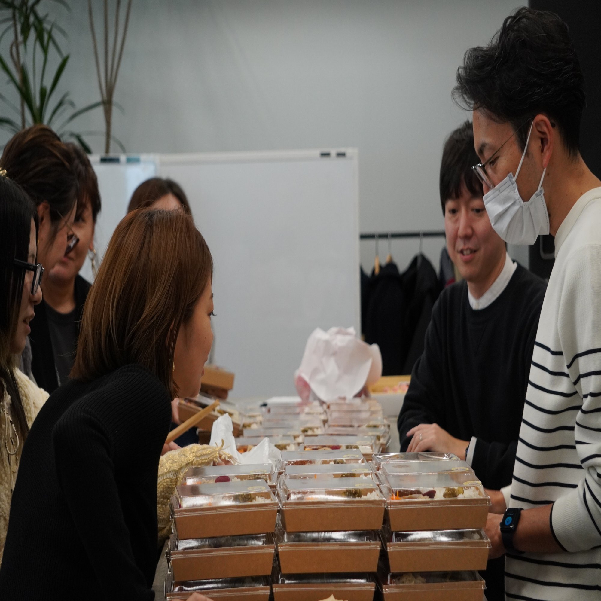 ・事業推進本部、メディア事業本部 副社長 富田直さん ・Platform事業本部 部長 新宮領宏太さん ・アライアンス推進室 室長 野田慎介さん ・イノベーションコンダクター事業本部、Consulting事業本部 執行役員 香川脩さん ・Consulting事業部 マネジャー 吉田翔さん ・インキュベーションクオリティ室 室長 下薗徹さん ・地域創生・イノベーション創出支援事業本部 部長 草柳友美さん ・地域戦略事業本部 執行役員/東海支社長 伊藤達彰さん ・人事本部 常務執行役員/CHRO 村田宗一郎さん ・boardより伝達事項 CFO 岡朋宏さん ■ランチタイム 前半戦が終了しランチの時間です。 ここでもコミュニケーション活性化のための施策がひとつ。 事前にアンケートを展開し、「語りたいテーマ」を募集して、10テーマに絞りチーム組成。 6~8名ずつのチームを組み、お弁当を食べながら共通の話題でトークをしました。