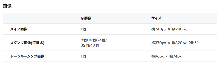 このサイズにあわせて、メイン画像1個、タブ画像1個、スタンプ画像(8個/16個/24個/32個/40個)を作成します。