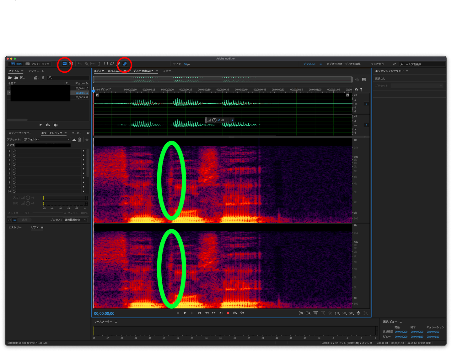 使い方はスペクトル表示にしてスポット修正ブラシで