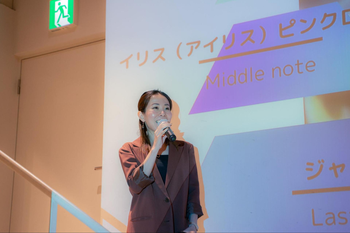 当日は、ブランド代表の大曲加七子が登壇し、香りに込めた想いや開発ストーリーを紹介。香水が苦手な方でも安心して使える“まとえるアロマ”として、天然精油のみで調香した3種の香り(Magnolia/Citrus/Savon)を体験いただきました。