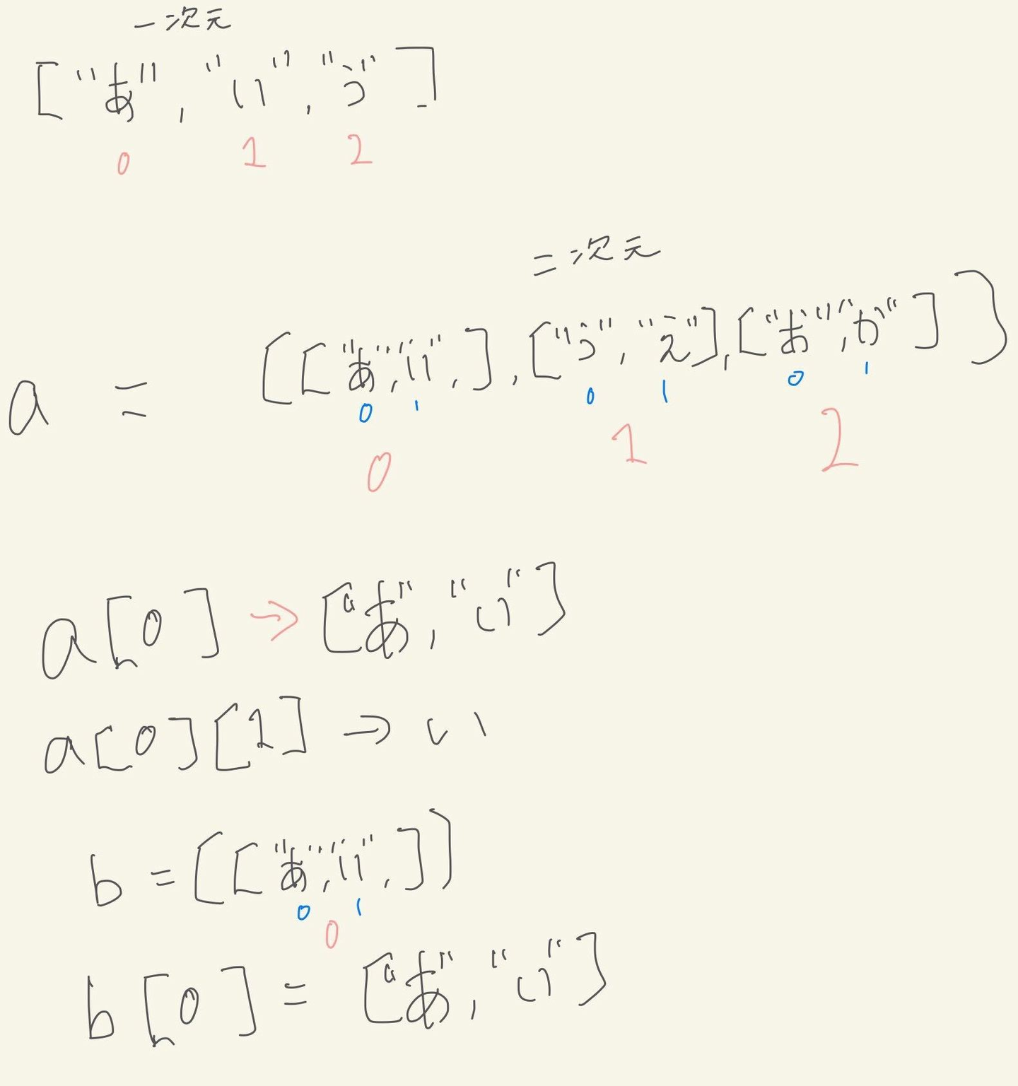 柱:この図を見て下さい。箱の中に複数箱が入っている状態ではなく、箱の中に一つの箱しか入っていない場合は、配列名[0]で一次元配列でだすことができます。