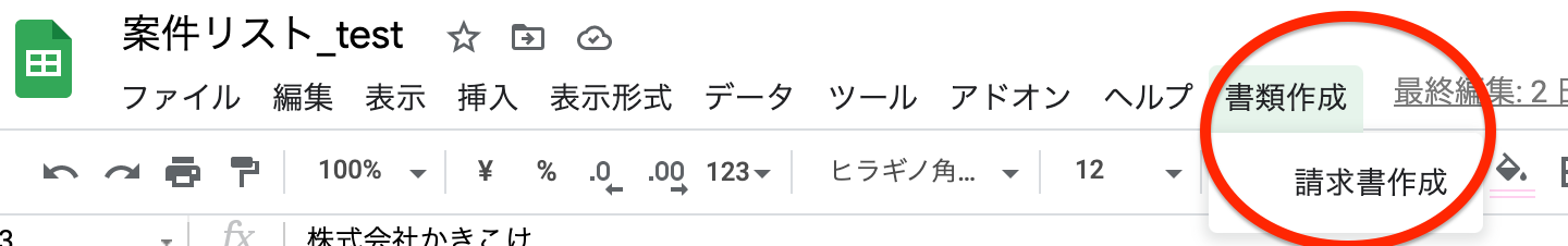 案件リスト(スプレッドシート)の上部に「書類作成」メニューを追加