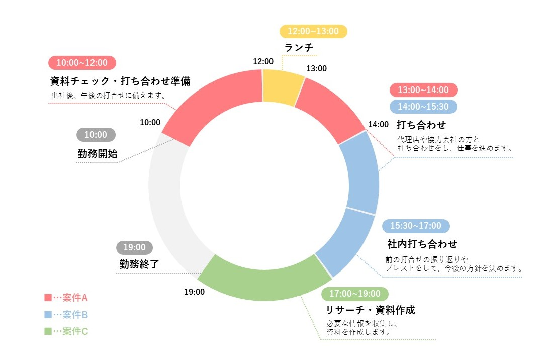 担当している仕事や、その進捗具合に応じて毎日違う業務をこなしています。