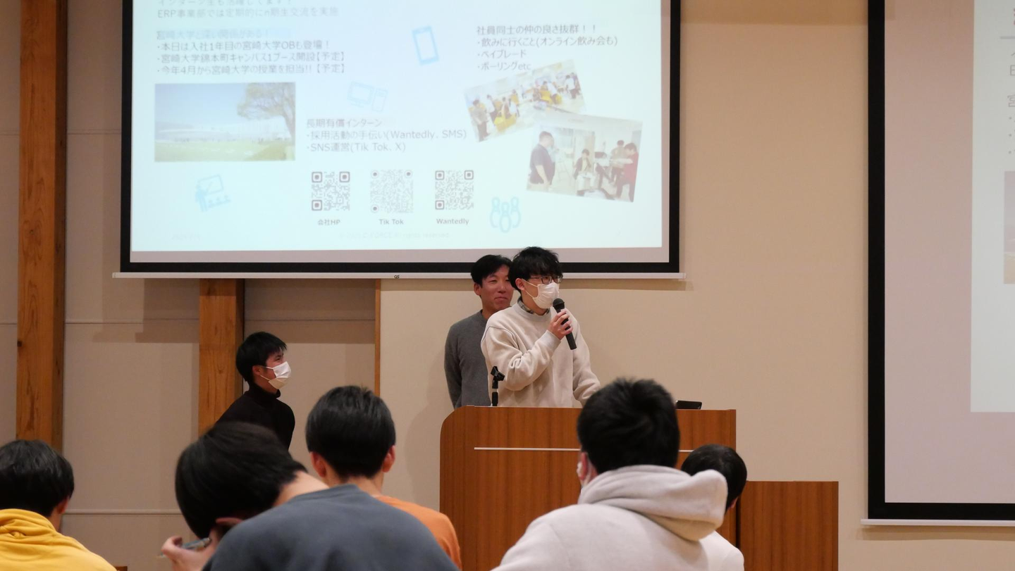 弊社からは、社長と宮崎大学OBの24卒入社の2名が参加をして、宮崎大学の学生さんたちと活発に交流してきました。