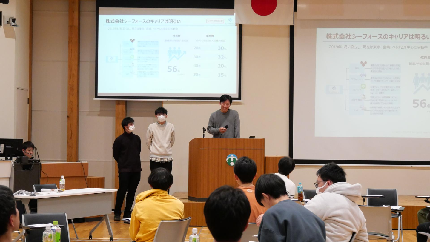 会社の基本情報はもちろんのこと、シーフォースが宮崎大学の学生さんたちにどのような活躍の場を用意出来るのかや今後のキャリアについて紹介しました。