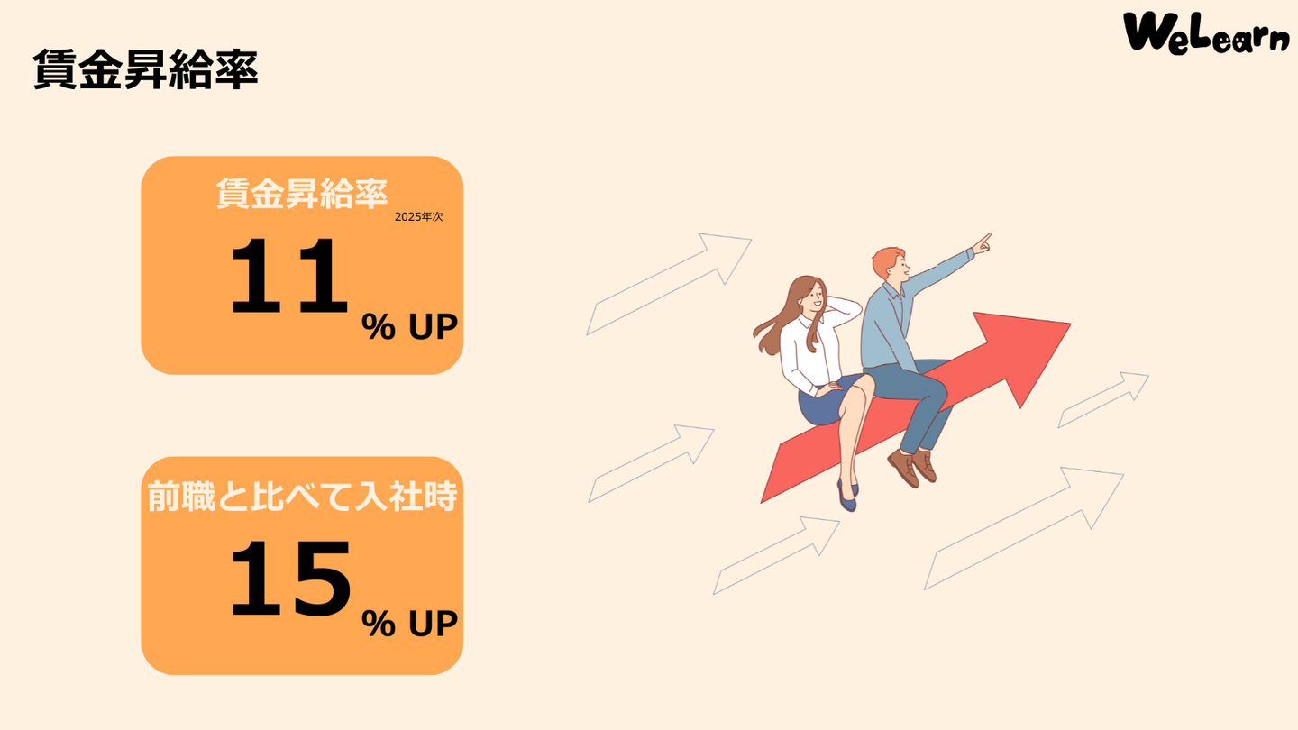毎年人事評価を行っており、2025年次のWeLearn平均賃金昇給率は約11%です。(正社員のみ)