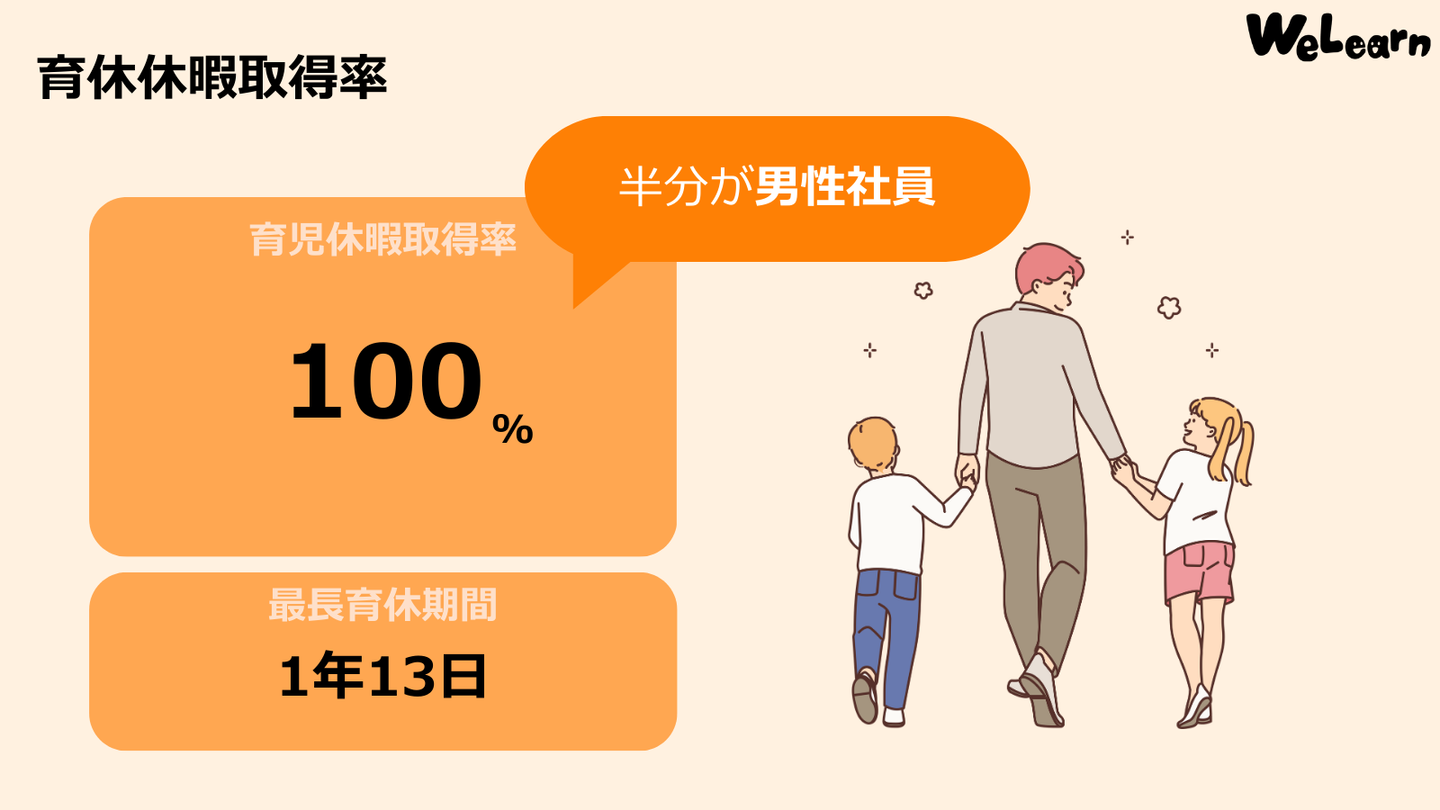 実際に育児休暇取得率は100%で半分が男性社員で男女問わず育児休暇を取得しやすい環境を整えております。