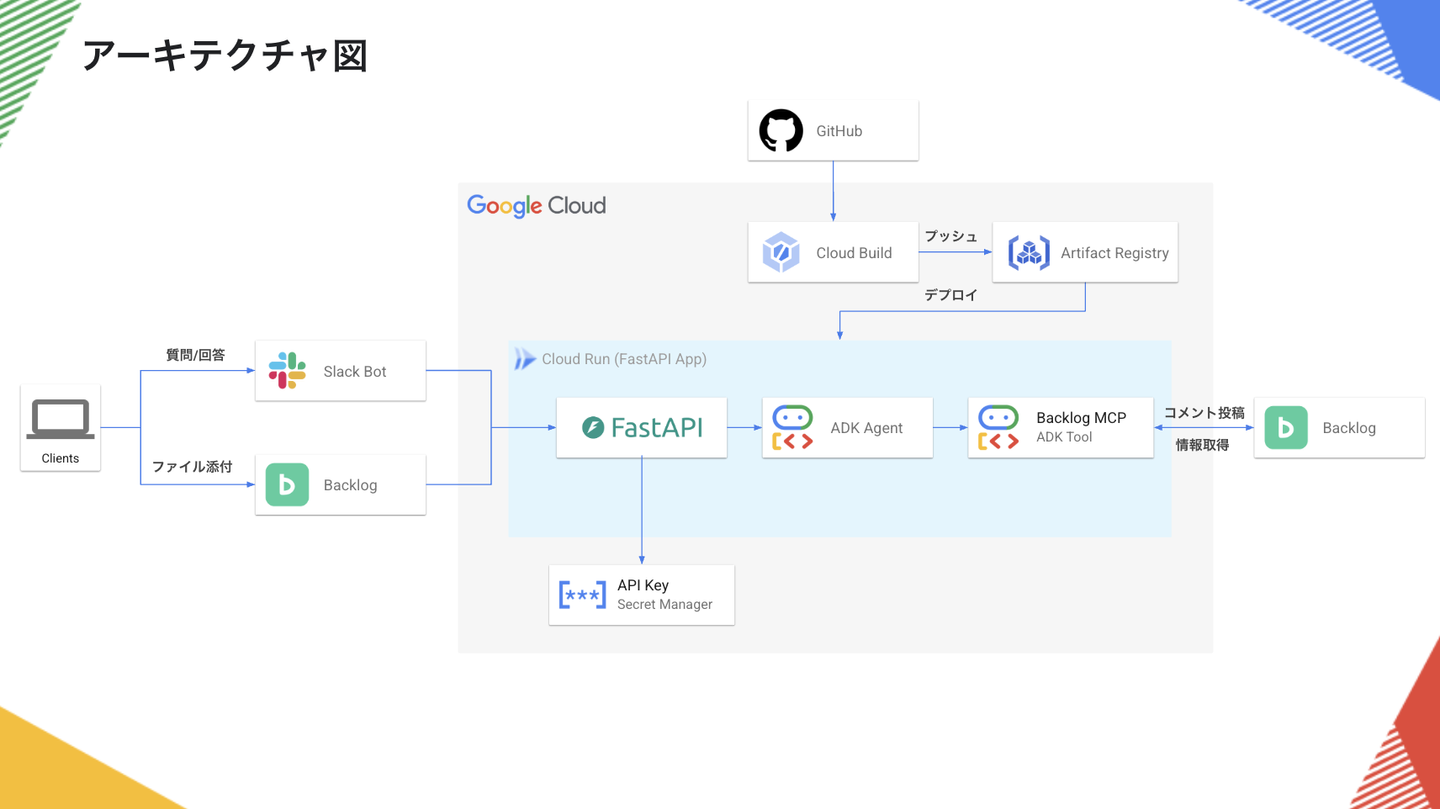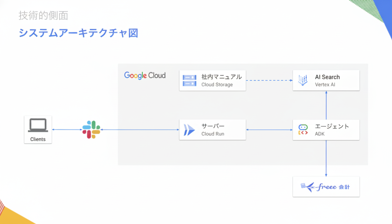 各チームは、人事・総務・法務・経理といったバックオフィス部門の課題を解決するため、Google の Agent Development Kit(ADK)と Google Cloud の各種サービスを駆使して、実用的なAIエージェントを構築しました。各チームごとの個性豊かなチーム名も注目ポイントです。