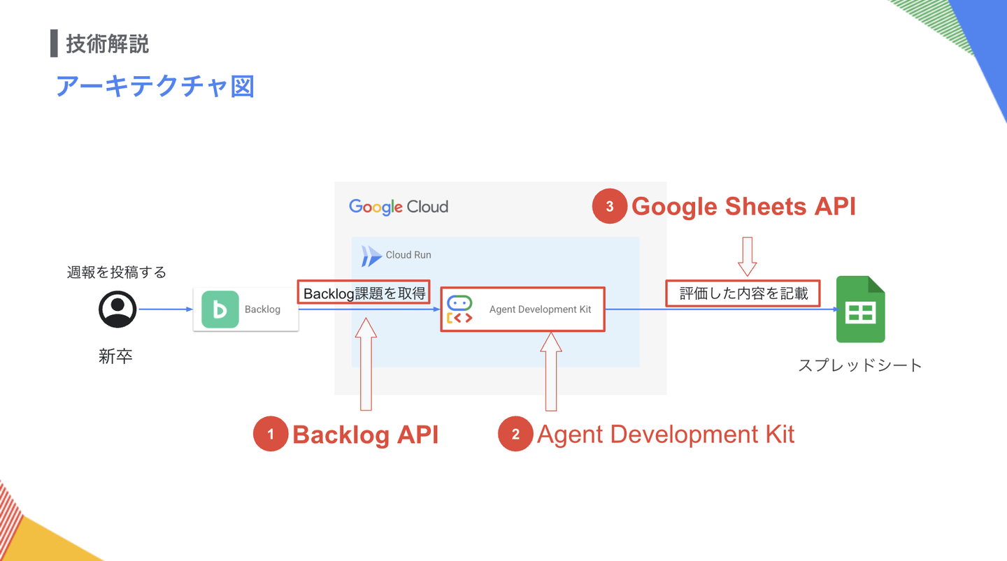 - 機能:Backlog に提出された新卒の週報を AI が自動で取得し、設定された3つの評価基準に沿って0,1,2のスコアと具体的なフィードバックコメントを生成→その結果をGoogle Sheets API でスプレッドシートに出力