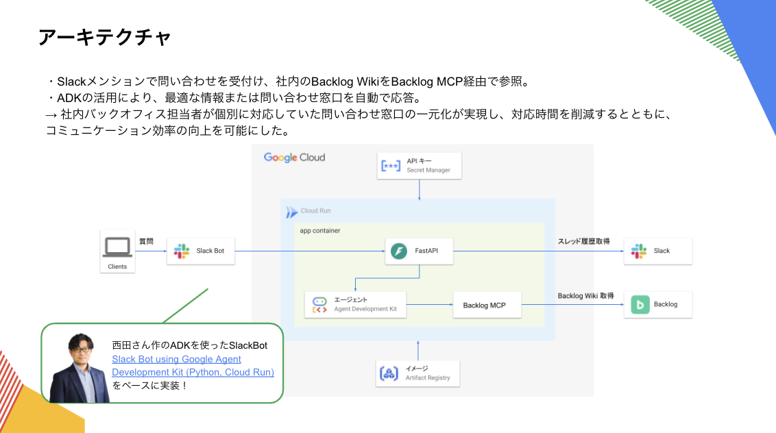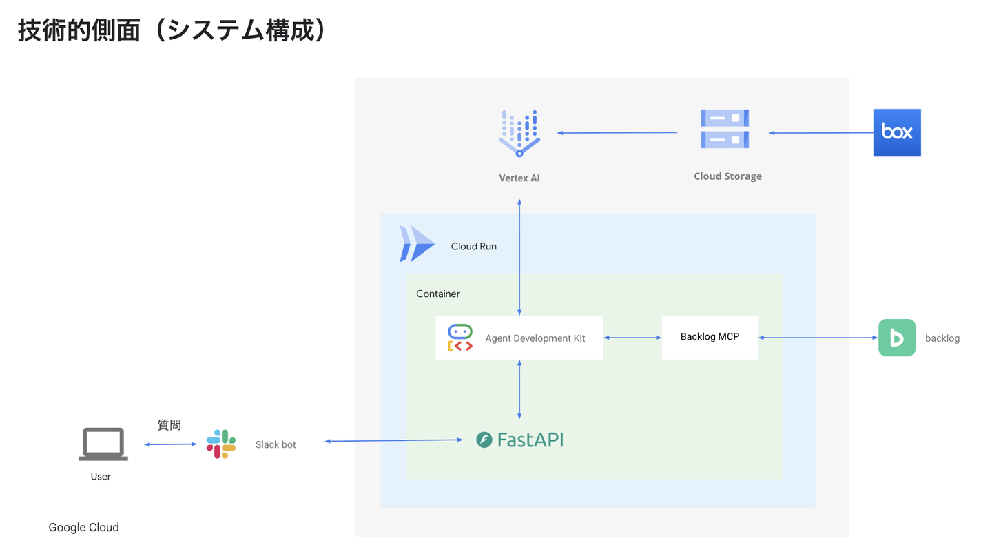 - 機能:Slack から質問すると、AI が Backlog の Wiki や Box の社内規定を参照し、回答と参照リンクを提供