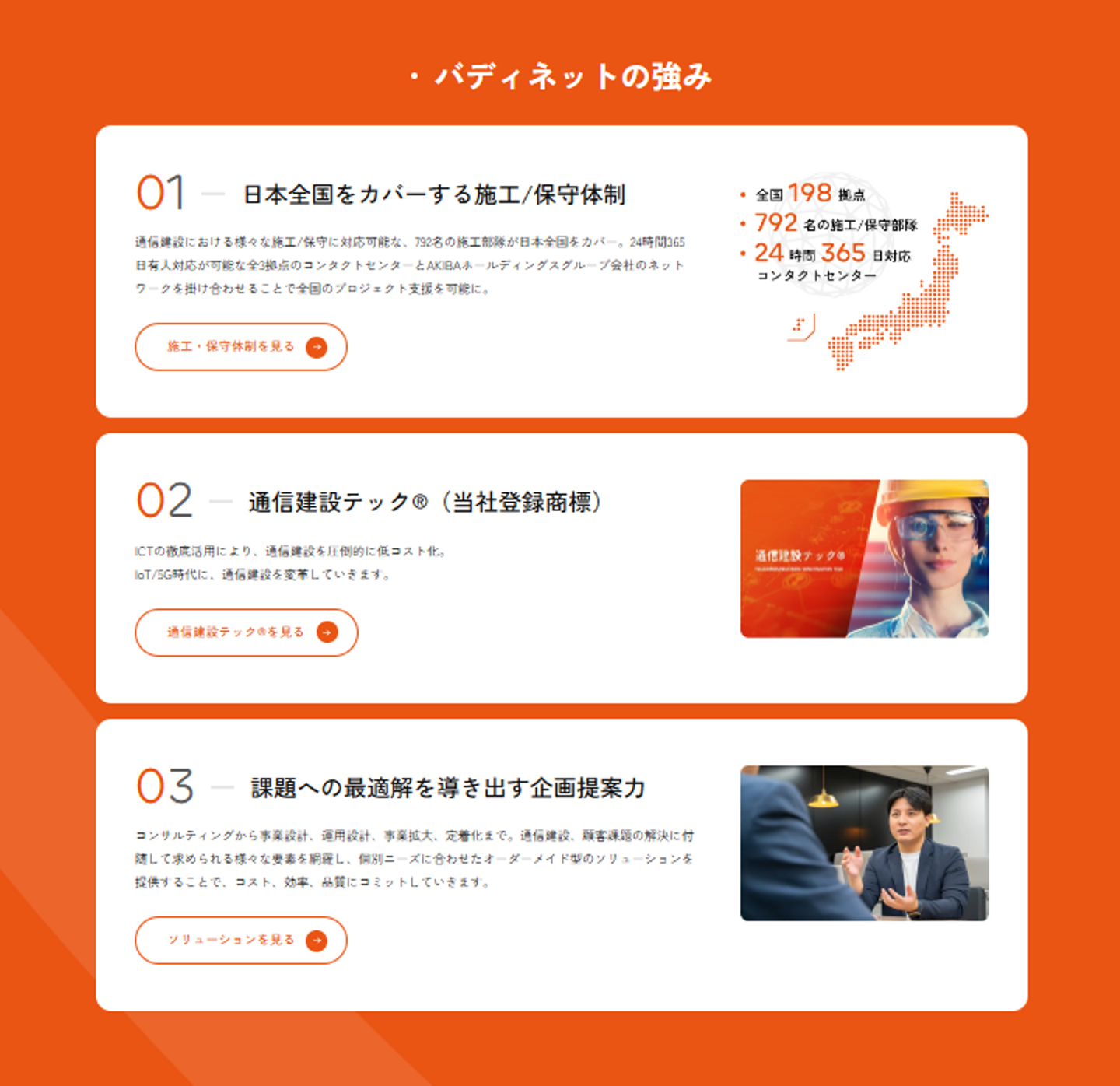 折衝から調査、設計、工事までをワンストップで行う各種通信設備の施工/保守から、24時間365日のコンタクトセンター、プロジェクト支援、ハードウェア・ネットワーク機器の開発など。バディネットの個別ニーズに合わせたオーダーメイド型のソリューションを、ぜひご覧ください!