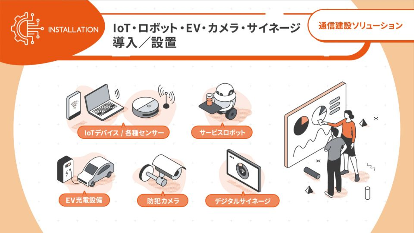 ITグループならではの知見と技術力を活かし、IoT デバイス、サービスロボットなど最先端技術に関わるデバイスや設備の導入や、設置に関するプロジェクトを数多く推進しています。