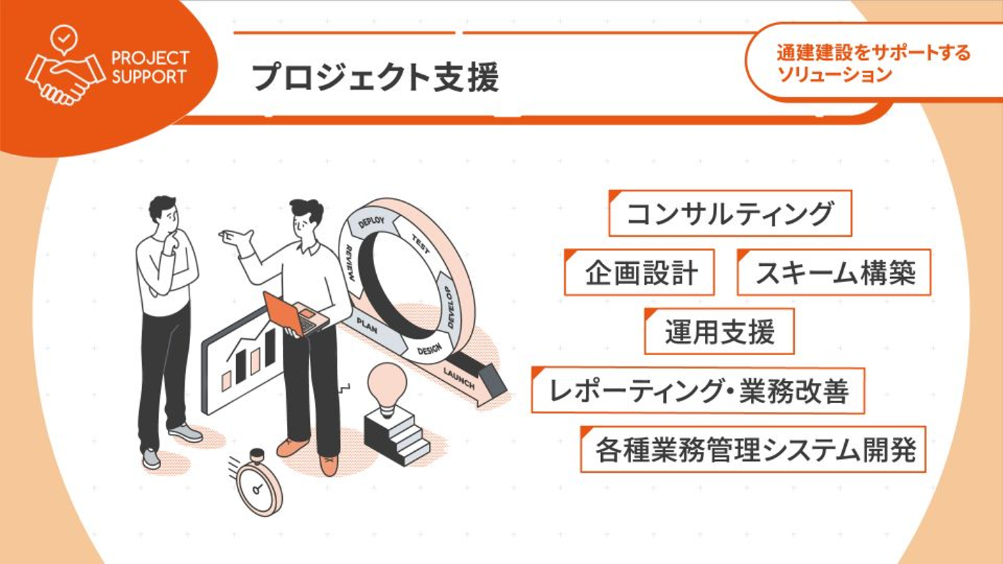 専属のコンサルティングチームが、通信建設事業をはじめ、ハードウェア、ソフトウェア、ネットワーク関連など、ITに関わる新規事業の立ち上げや既存事業のスケールアップを圧倒的なスピードで支援しています。