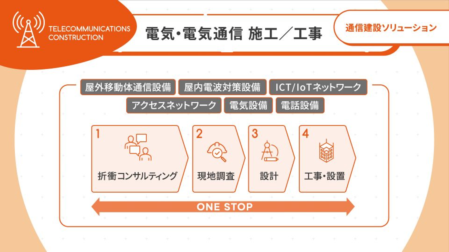 通信キャリアや大手電気メーカーなどのお客さまを中心に、様々なインフラ構築工事を手掛けております。折衝コンサルティング、現地調査、設計、工事・設置などあらゆる工程に対応可能な通信建設サービスを提供しています。