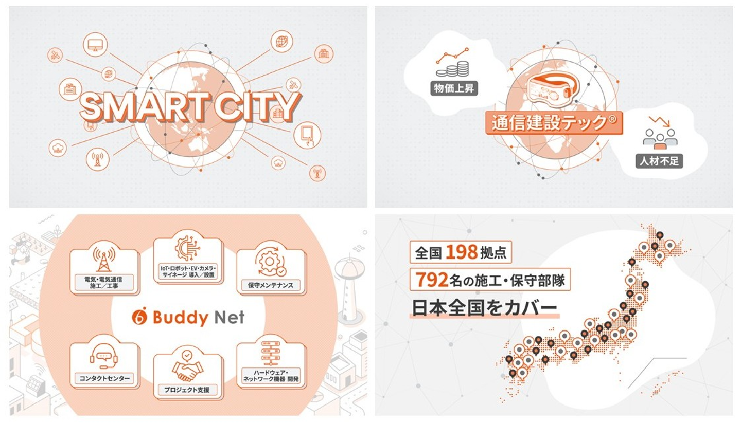 また、AKIBAホールディングスグループ全体のリソースや全国規模の施工・保守体制を表現したアニメーションも登場し、バディネットがどのような通信建設工事会社であるかを表現しています。