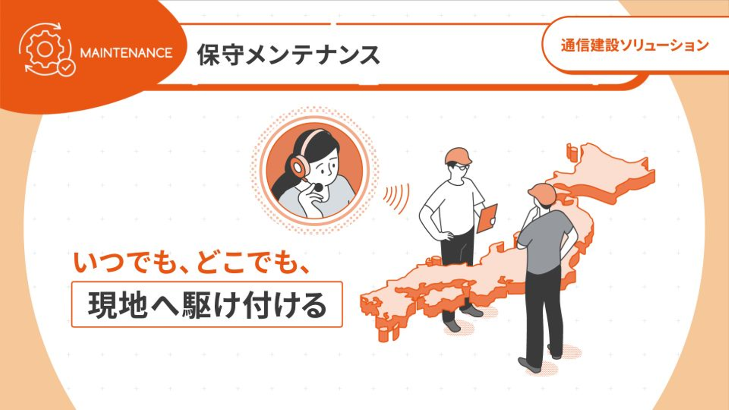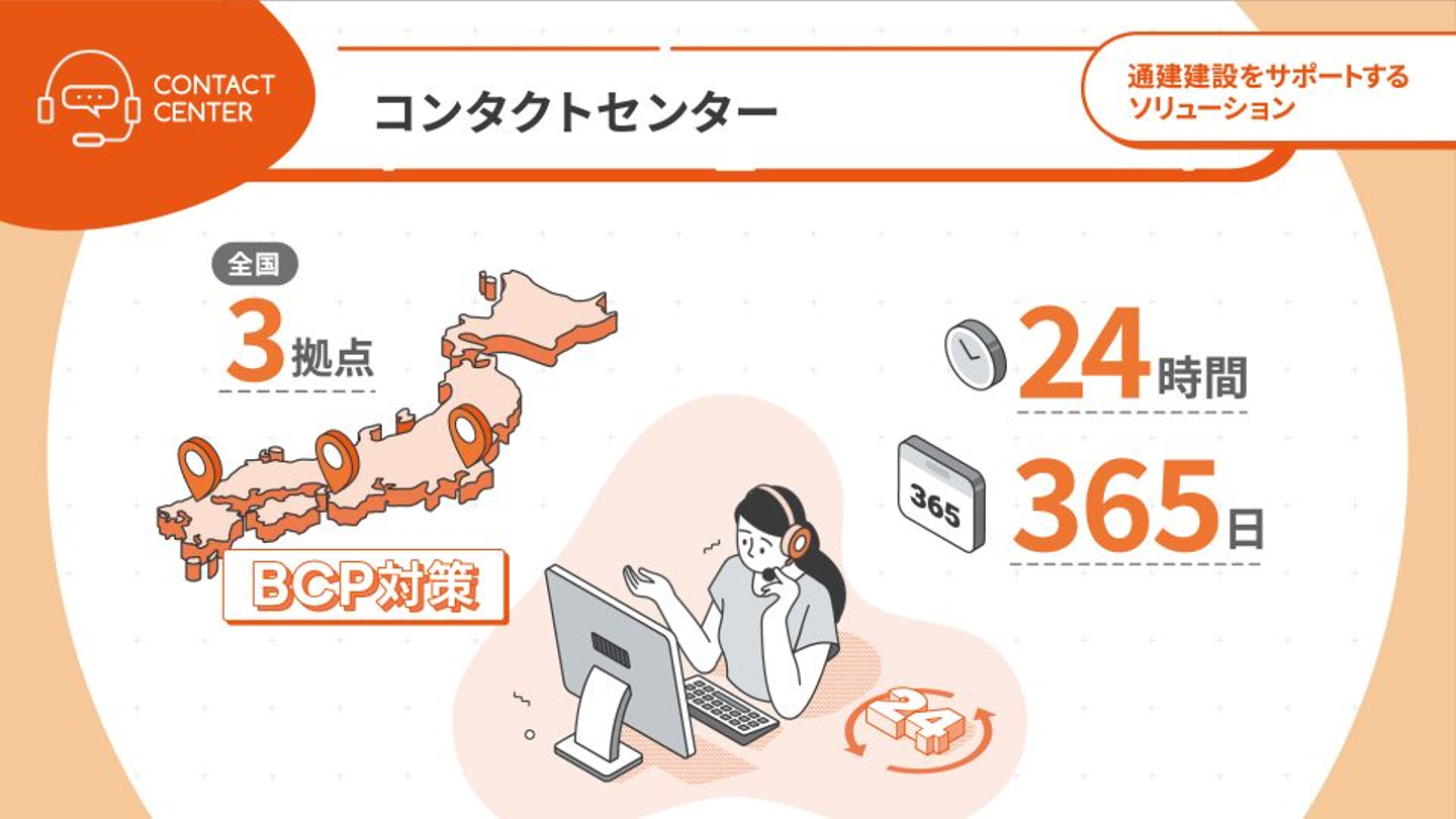 全国3拠点に分散するマルチサイトでBCP対策された24時間365日体制のコンタクトセンターは、アウトバウンド、インバウンド問わず、様々なご要望にお応えしています。日本全国をカバーする施工・保守体制と連携することで、テクニカルサポートやディスパッチセンターなど豊富なソリューションでお客さまのビジネスを強力にバックアップいたします。