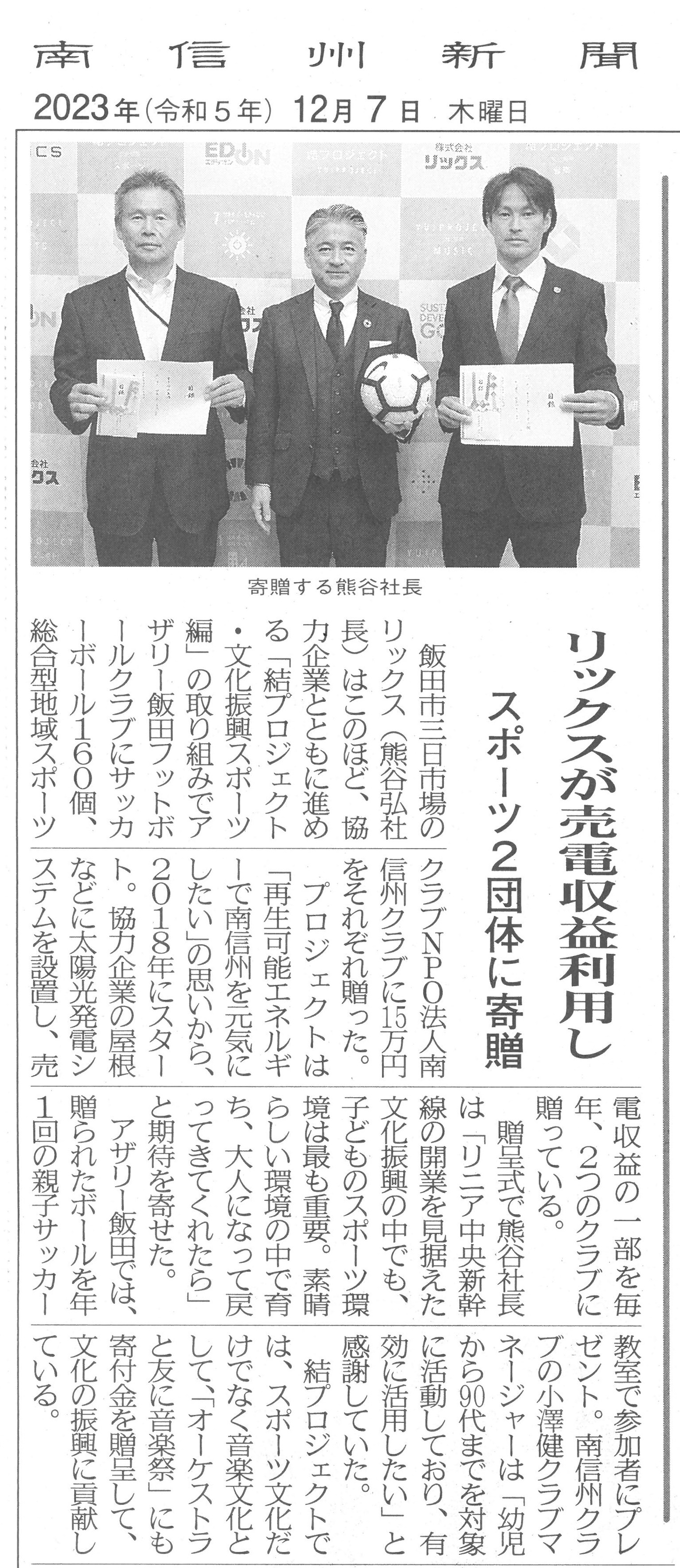 アザリーFC飯田と南信州クラブへの寄贈式 毎年行っております