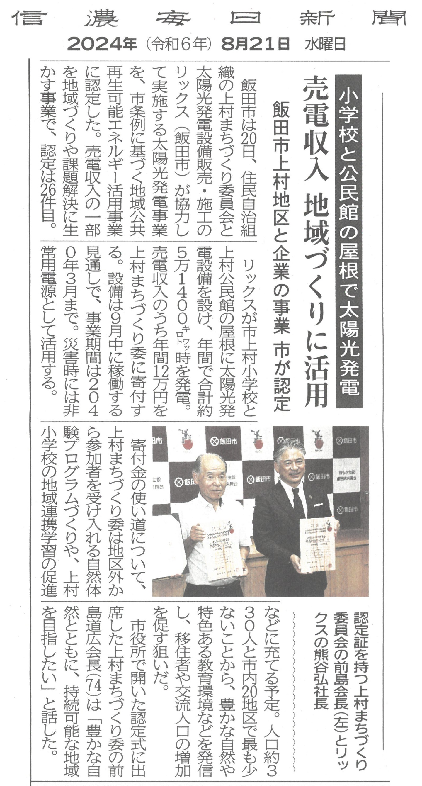 上村小学校、上村公民館に太陽光発電設備を設置させていただき