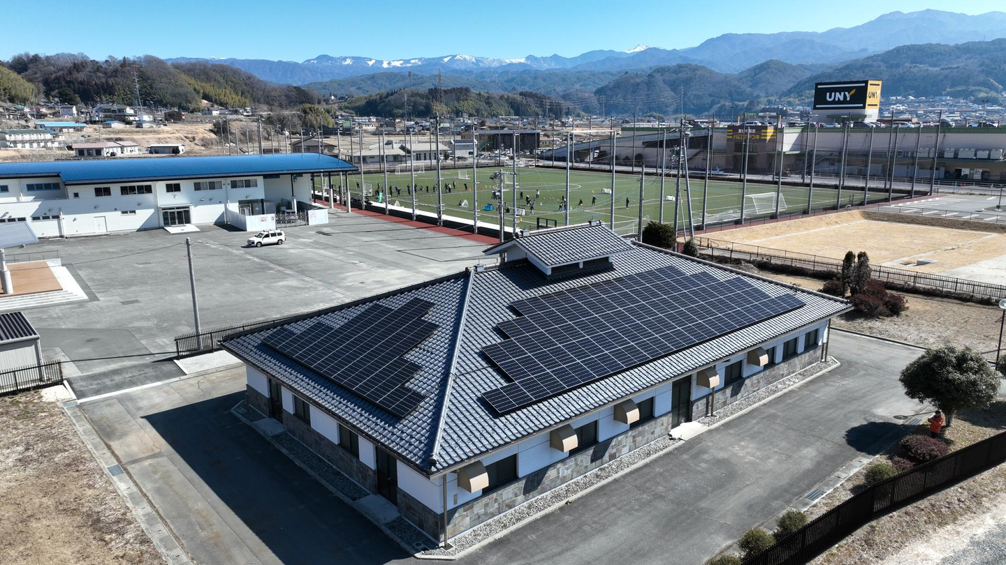 太陽光発電の電⼒を蓄電池に貯めて、サッカー場の照明だけでなく、クラブハウスへの電源に供給することで、⾮常時も電灯を始め、スマホの充電など含めた対応が可能となり、サッカー場としての施設の付加価値が向上します