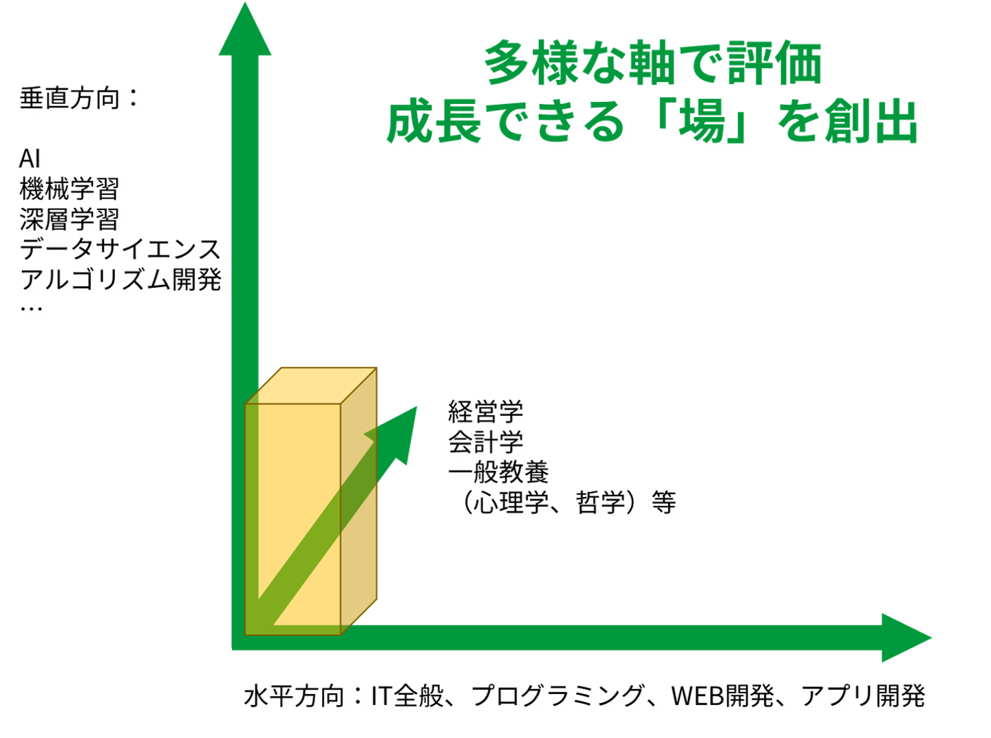 まず縦軸として、AI分野があります。機械学習や深層学習、データサイエンスといったAI分野の知見を深めています。この軸はJDLAの認定講座であるDeepSquareなど社内に体系的な知見があるので、社内の知見をフル活用して成長できる環境があります。AIエンジニアになるために必要となる知識を独自で勉強するのはなかなか難しく、一人で頑張っても乗り越えにくい問題がたくさんあります。そうした時に、仲間がいればみんなで話し合い、学び合いすることで、個人の成長、そして組織の成長が期待できます。