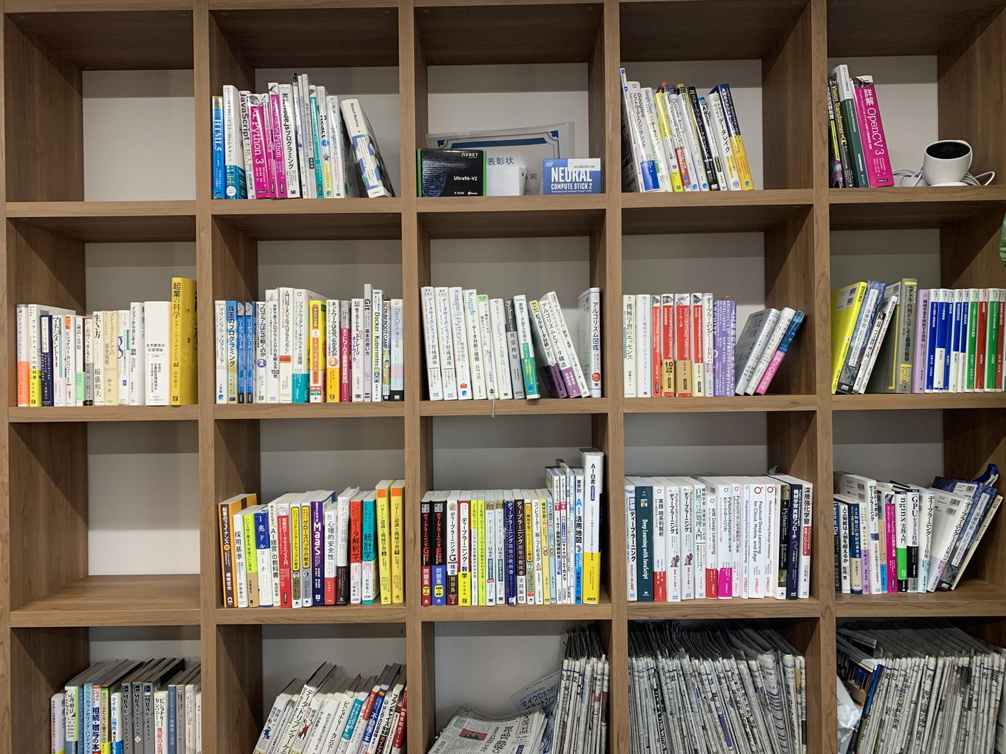 ※会社の本棚です。AI、機械学習、経営等の本たくさん並べています。社員に無料で貸出しています。