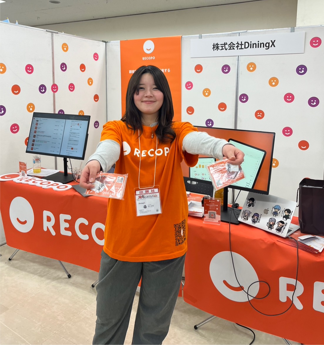 展示会当日は、飲食業界で活躍される多くの方々とお会いすることができました。私たちのブースでは、サービス「RECOPO」の紹介を中心に、ティッシュやチラシ配りも大奮闘!少しでも多くの方に知っていただけるよう、笑顔で積極的にアピールしました。