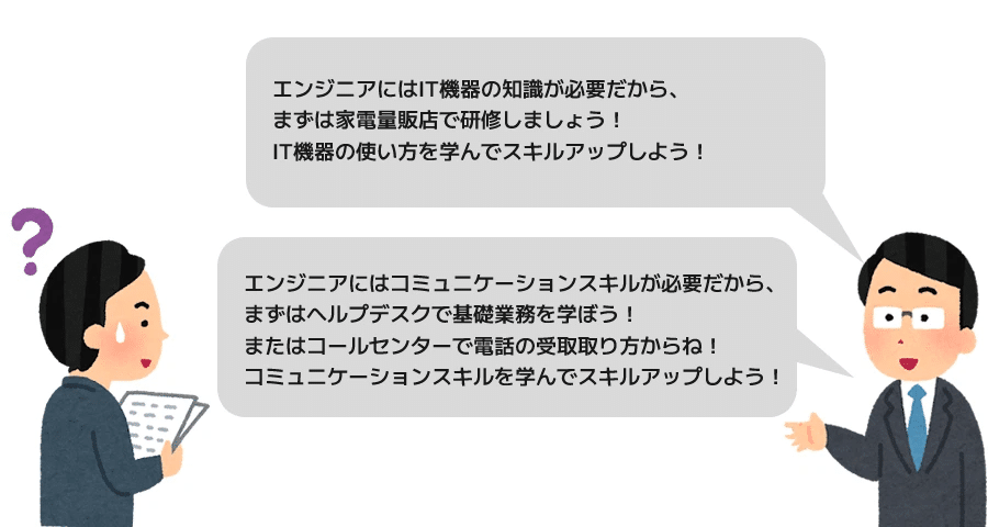 一方でブラックSES企業は低コストで人材を育成するために、未経験者を家電量販店や携帯ショップ(あとはキッティング作業やヘルプデスクやコールセンターとか)に派遣することがあります。このような環境では、ITエンジニアとして専門的なITスキルを身につけることは難しいです。顧客対応や商品販売といった業務に集中するため、プログラミングやシステム開発といったITエンジニアとしてのスキルを磨く機会は限られてしまいます。結果として、ITエンジニアとしての成長が遅れてしまう可能性があります。時間を無駄にしてしまいます。