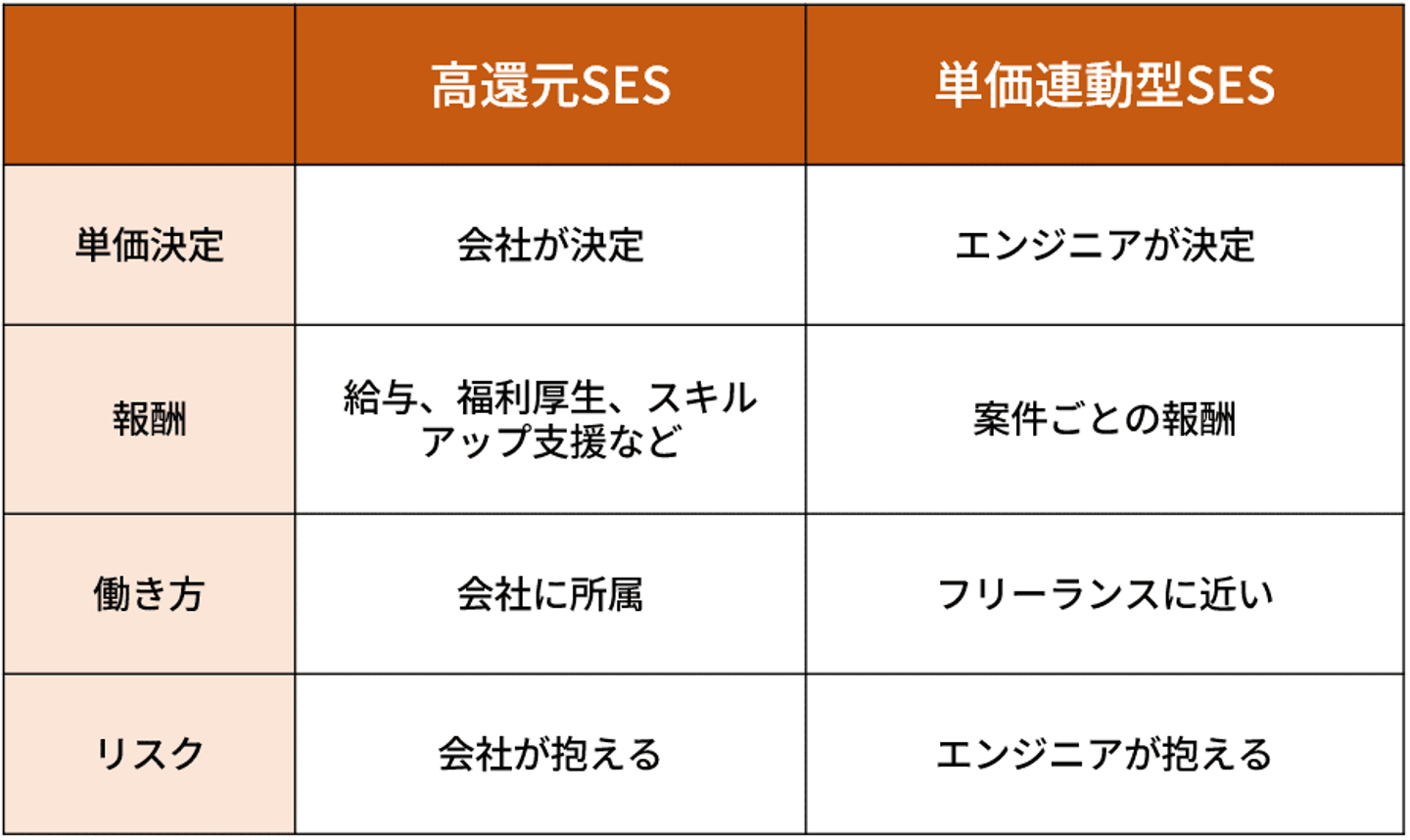 高還元SESと単価連動型SESは、どちらもエンジニアにとって魅力的な働き方ですが、いくつかの違いがあります。