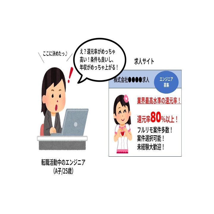 つまり、ITエンジニアの採用時には還元率を高く見せて、あたかも給与が多くもらえると錯覚させて、情報弱者のエンジニアの応募を募るという手口・手段です。