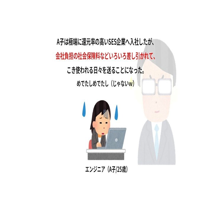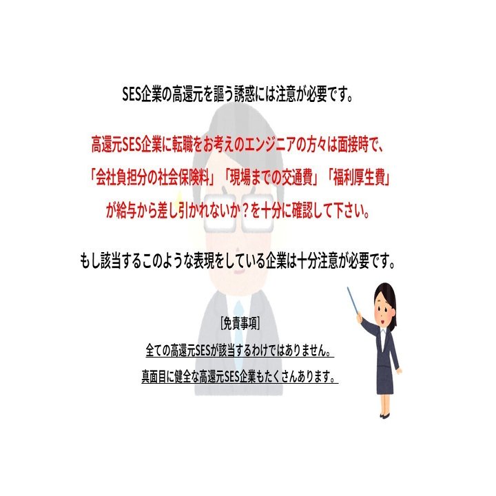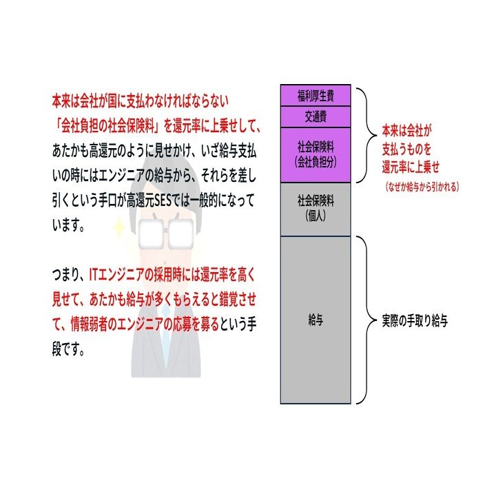 本来は会社が国に支払わなければならない「会社負担の社会保険料」を還元率に上乗せしてあたかも高還元のように見せかけ、いざ給与支払いの時にはエンジニアの給与から、それを差し引くという手口が高還元SESでは一般的になっています。