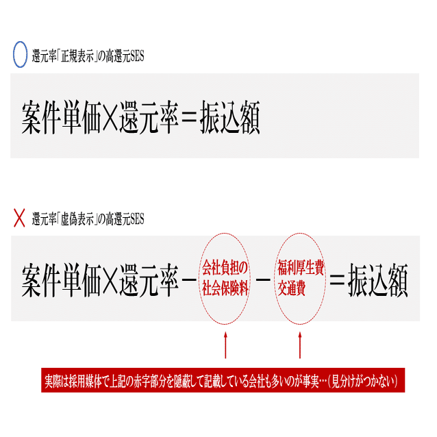 高還元SESの多くの求人媒体には大きく「業界最高水準の高還元率!」と大々的に書かれていましたが、実際は単価の50%程度の収入だったとのこと…