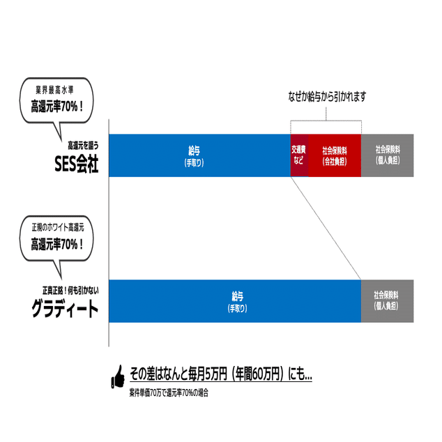 因みに「よくある高還元SESの計算方式で例えると弊社の還元率は約80%+α以上」となります。グラディートは極端な高還元率を謳うのではなく、嘘偽り無く、正々堂々と提示しています。(会社負担分の社会保険料を給与から差引きはしません!)