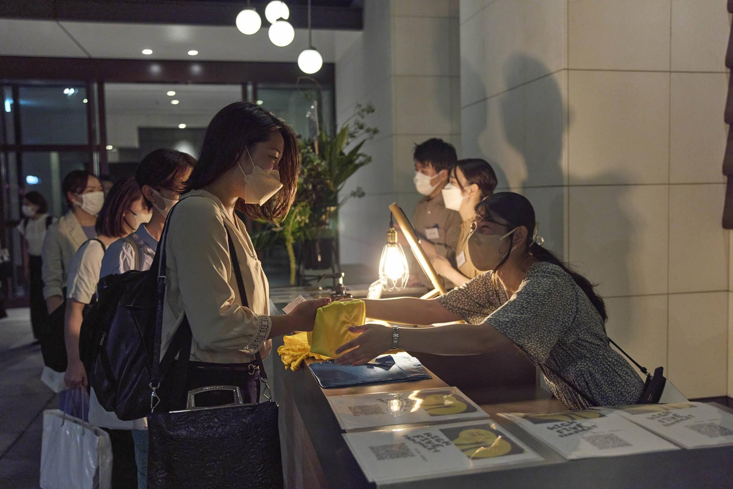 入り口では、今回の企画に主体的に関わってくれた内定者が受付です。こだわり抜いた参加者の名札(※前編参照)を渡し、デジタル化した式次第をQRコードで皆さんに読み込んでいただきながら会場に入ってもらいます。