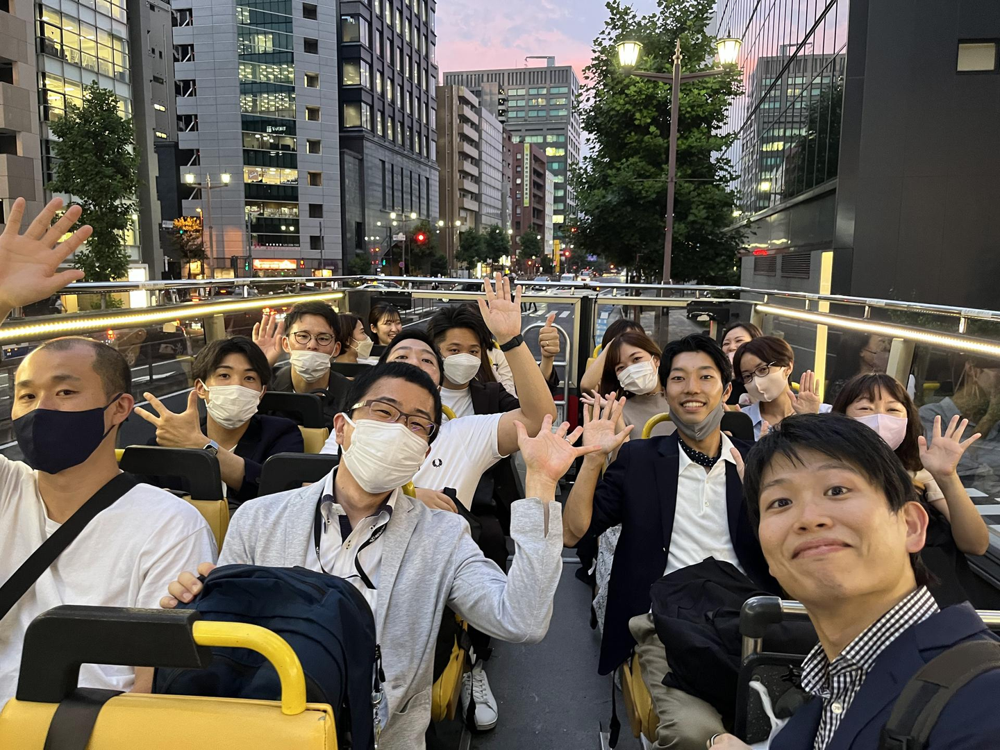 会場はオフィスではなく、都内の夜景を間近に見ながら、貸し切りの2階建てバスでシークレット会場まで向かいます。