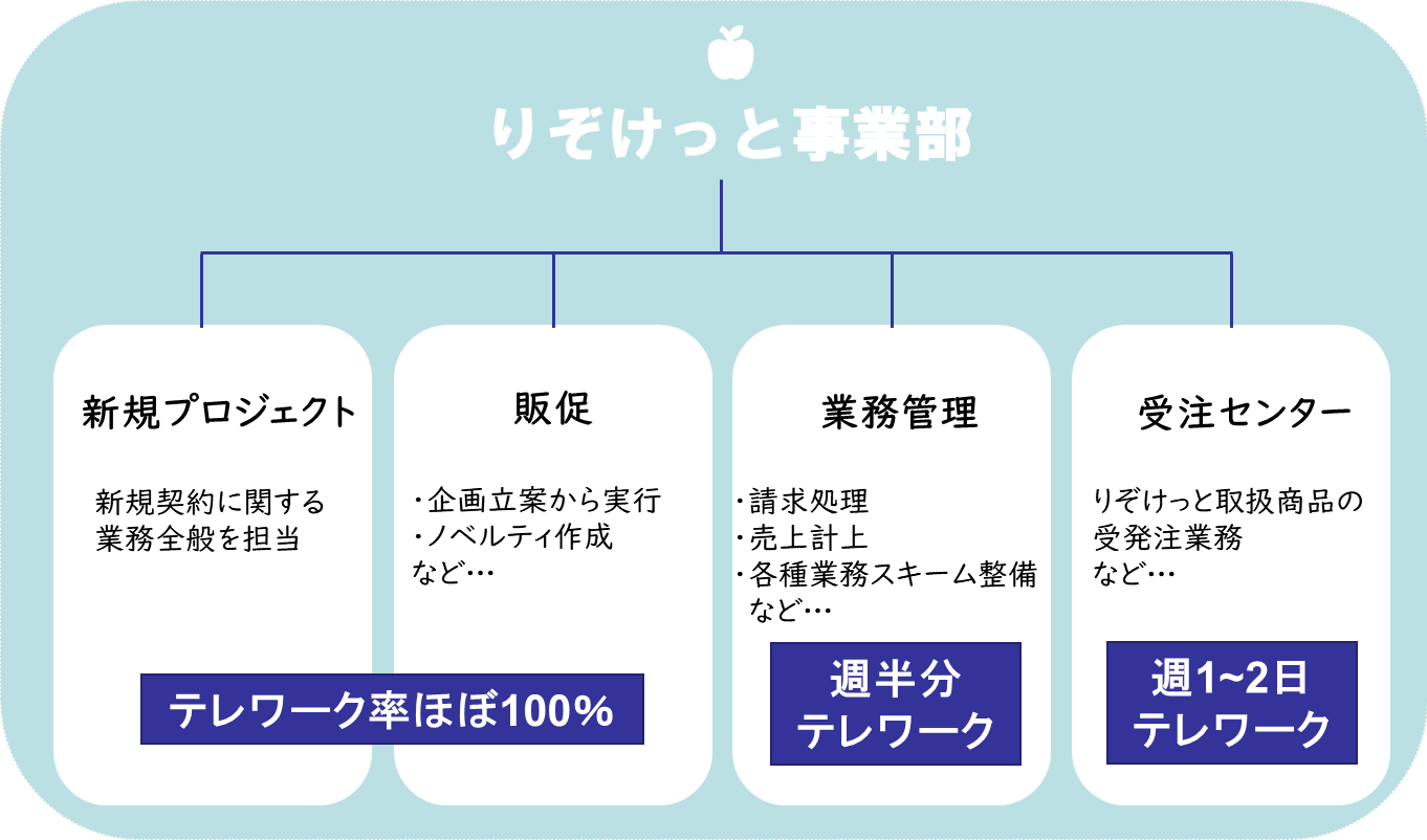 りぞけっと事業部におけるテレワーク頻度現在当社にて募集しているりぞけっと事業部について、事業部内のチームとそのテレワーク頻度は以下の通りとなっております(2021年6月時点)。