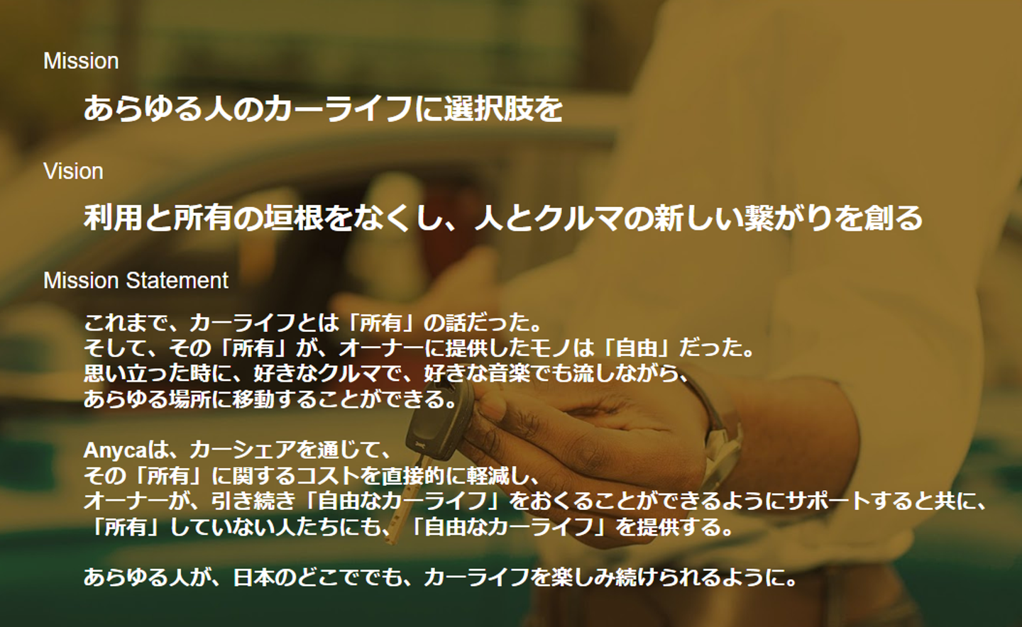 当社のカーシェアアプリ「Anyca(エニカ)」はCtoCカーシェアとしてスタートし、ユーザー数50万人超、累積カーシェア日数28万日以上へと成長。現在は新規事業にも積極投資しており、新たなフェーズに突入しています。