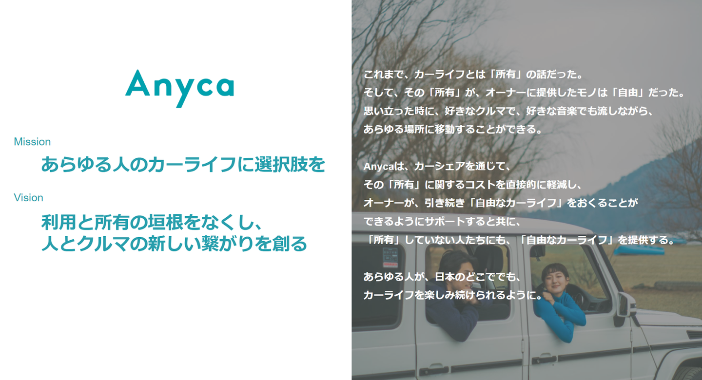 当社のカーシェアアプリ「エニカ(Anyca)」はクルマをシェアしたいオーナーと運転したいドライバーをマッチングするカーシェアサービスです。