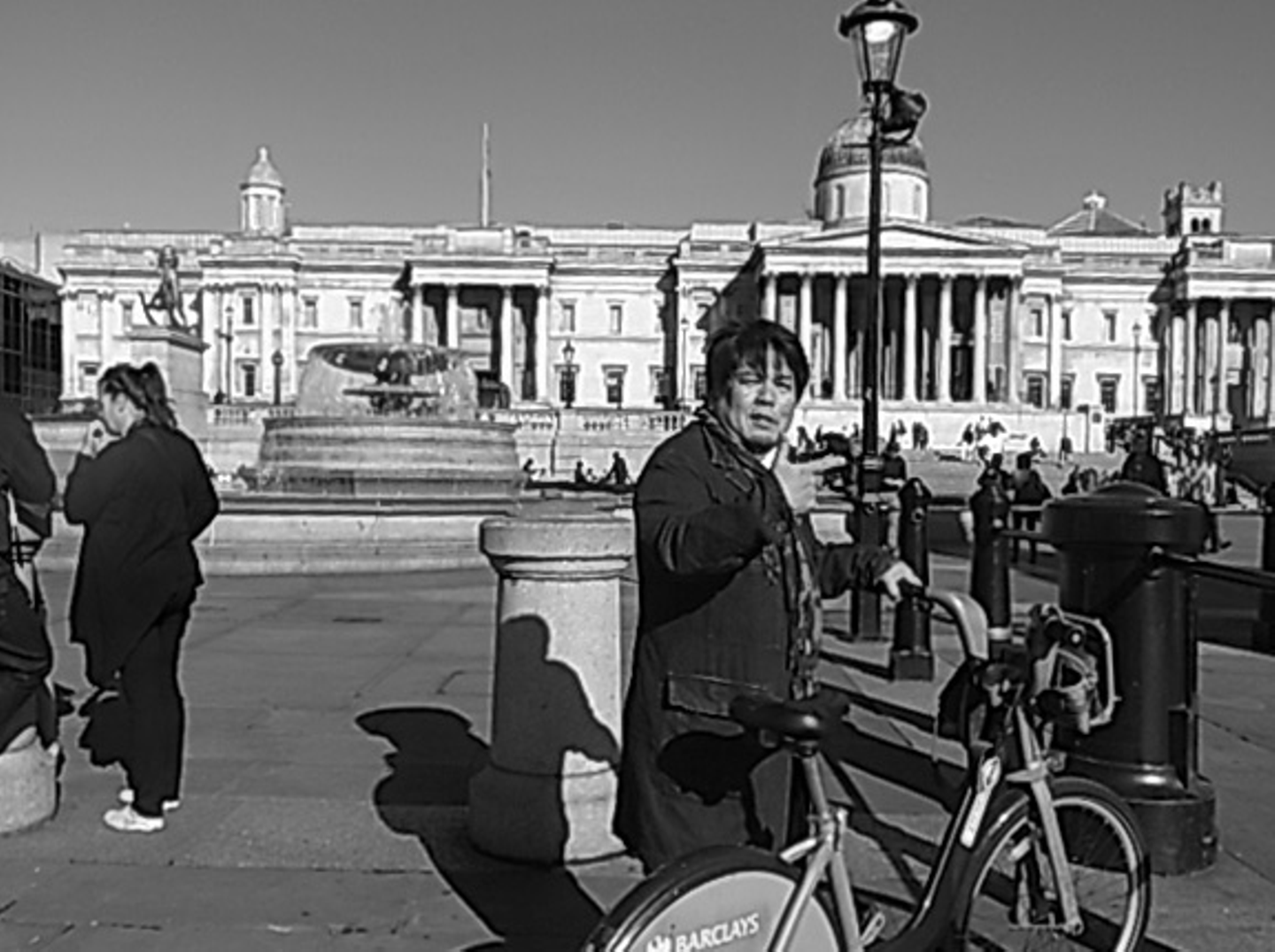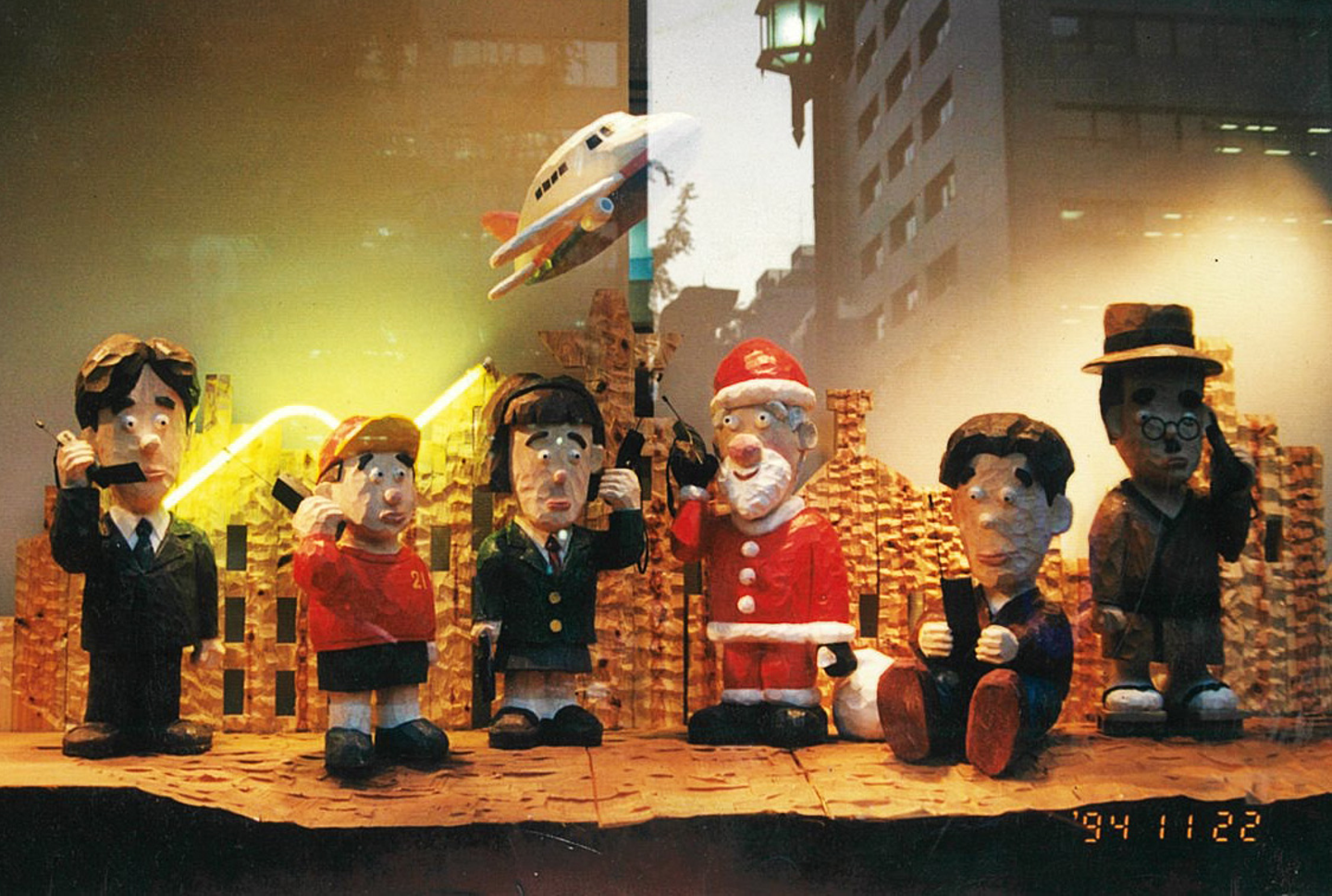 1994年 某携帯会社のショーウィンドウデザイン。木彫り風の携帯を持ち働く人。