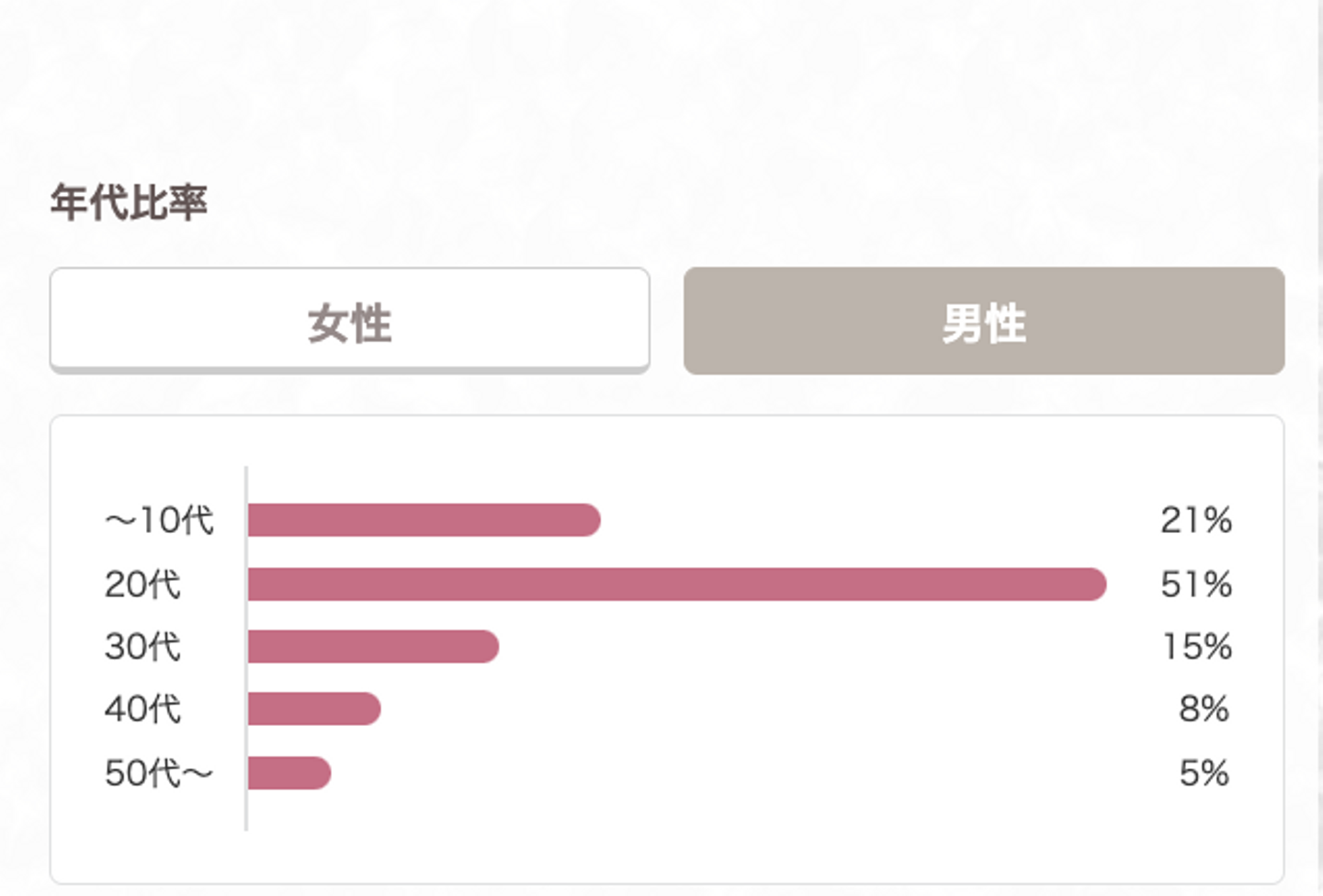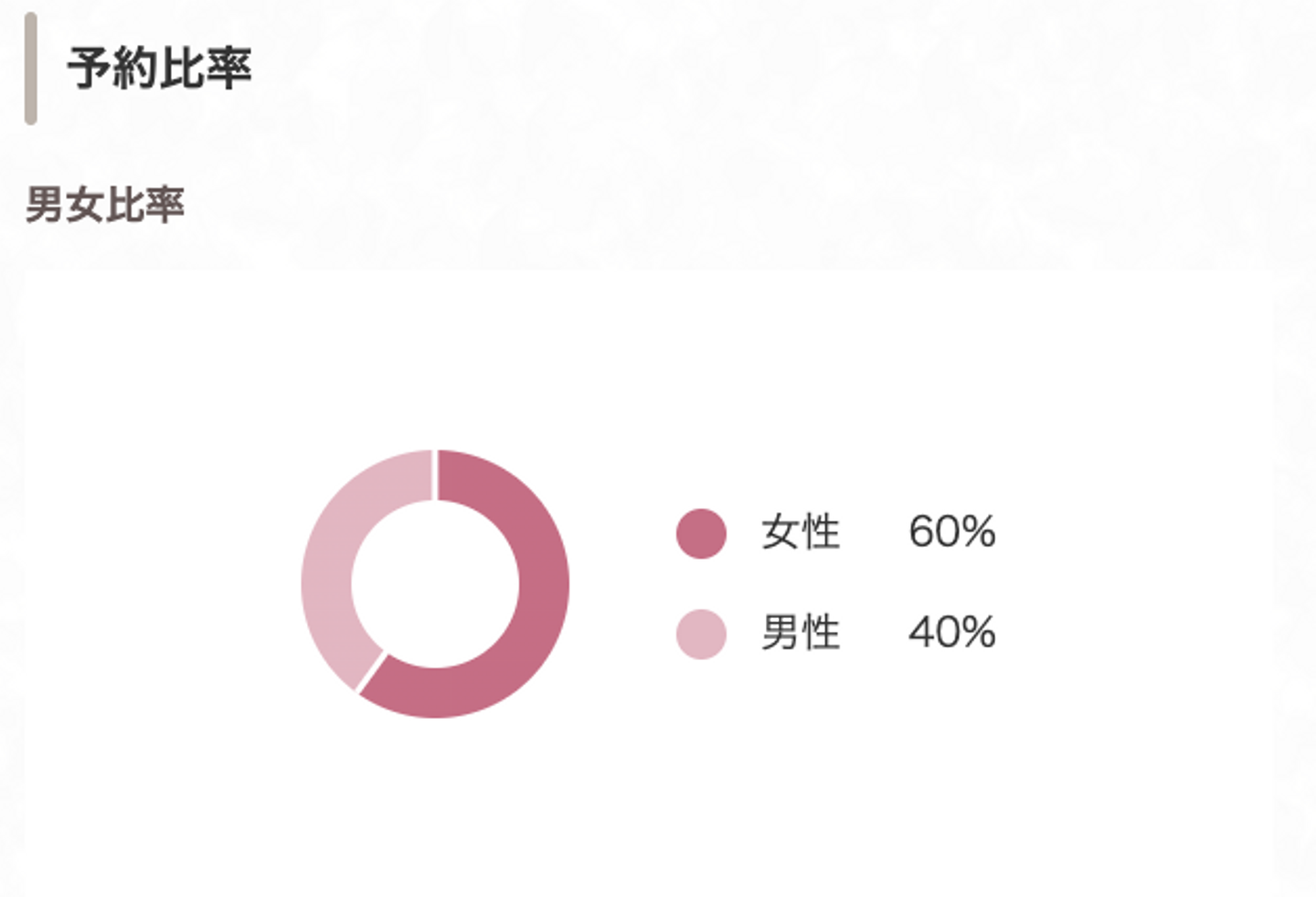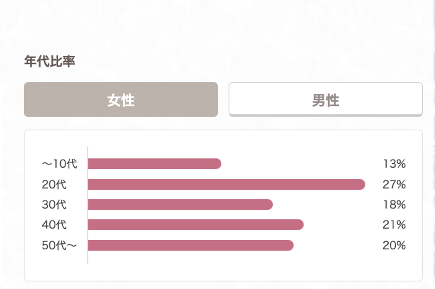 お客様の層としては男女比率は男性4割・女性6割で10代から50代・60代以上と年齢性別バランスよく、老若男女の方に通っていただいています。