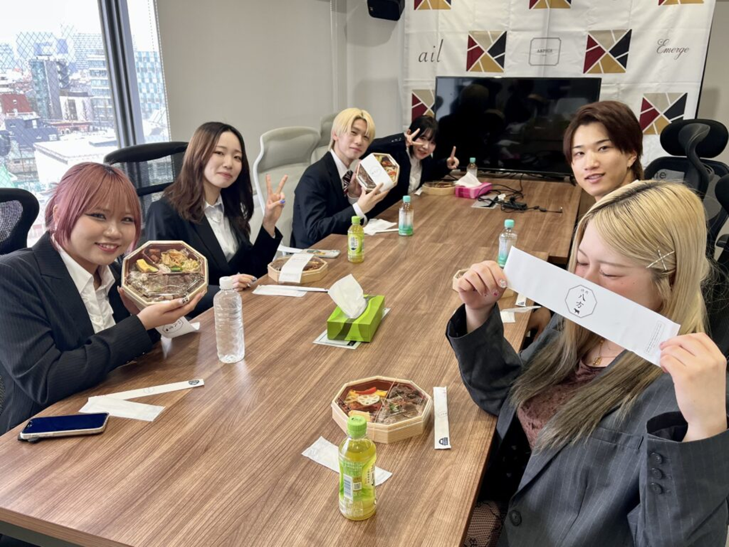 ▲同期どうし親睦を深めながらの昼食タイム。用意したお弁当を「おいしい!」と食べてくれて一安心でした。