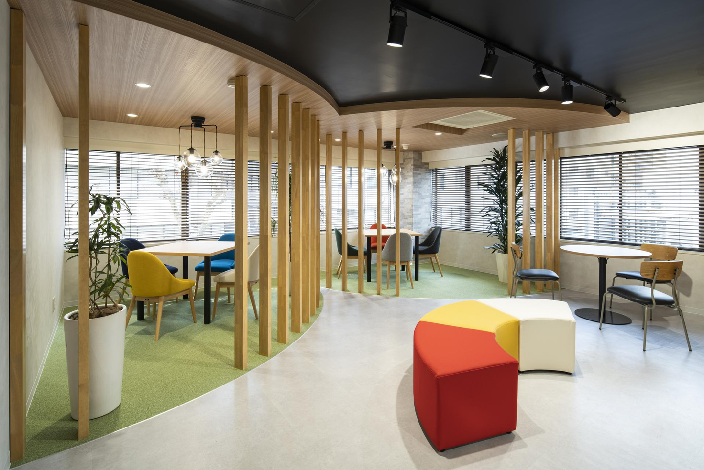 ▲青・緑・黄色・オレンジ・ピンクのコーポレートカラーを使用した商談スペース