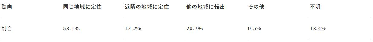 地域おこし協力隊の任期終了後の動向についてですが、同じ地域に定住する人が53.1%、近隣の地域に定住する人が12.2%ということで、地域創成活動に参加した65.3%の人が同じ地域内で定住している結果となりました。地域おこし協力隊に参加した人の半数以上が活動した地域で住み続けているというわけです。地域おこし協力隊の制度では任期終了後の就労支援や起業支援もおこなっていますので、国のサポートを受けて住み続けることを希望する人が多いようです。53.1%の同じ地域に定住をした人のうち、41.4%は起業しており、39.1%の人は就業していることがデータとして確認されています。その他の方は就農・就林が11.5%、事業承継が1.2%となっています。