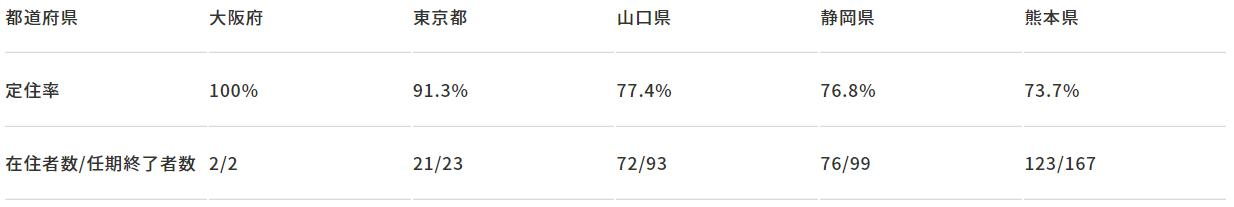 地域おこし協力隊の都道府県別の定住率についてですが、大阪府と東京都が高い数値を出していますが、母数としての数値が少し足りないため実態を把握できるのは3番目の山口県からでしょう。山口県への定住率は77.4%、静岡県への定住率は76.8%、熊本県の定住率は73.7%という結果になりました。