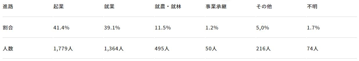 地域おこし協力隊として活動した地域に定住した人のその後の進路としては、起業する人が一番多く41.4%、就業する人が39.1%、就農・就林する人が11.5%となっています。前年度と比較をすると、起業する人は505人増えており、就業する人も314人増えています。