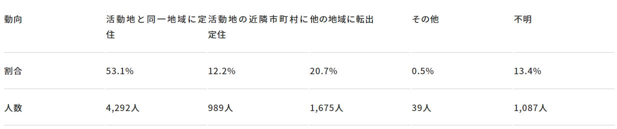任期を終了した8,082名へのアンケート調査によると、活動期間が終了した後も同じ地域に定住する人が65.3%(53.1%+12.2%)いて、半数以上の人が定住先での活動を続けています。前年度から比較すると、同一地域に定住する人は982人増えており、近隣市町村に定住する人も185人増えています。