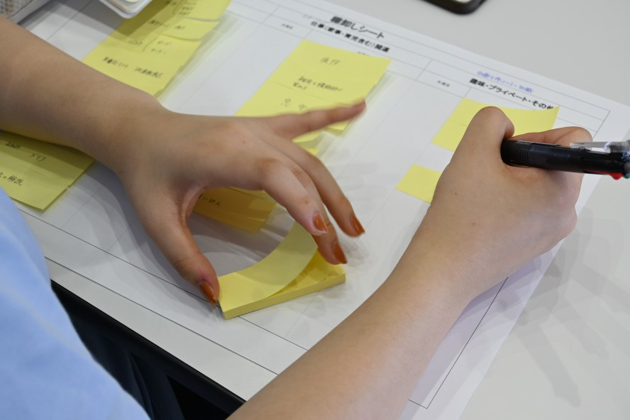 5分書き出した後の整理タイムでは、付箋に書き出した好きを似たもので分けて大項目を作りました。3つの枠での書き出し作業と整理が終わると、一旦全体を眺めてみて、特に好きだというものや得意だというものを最低3つ以上見つけて丸を付けました。全体を俯瞰してこれだなというものをピックアップしてもらいました。
