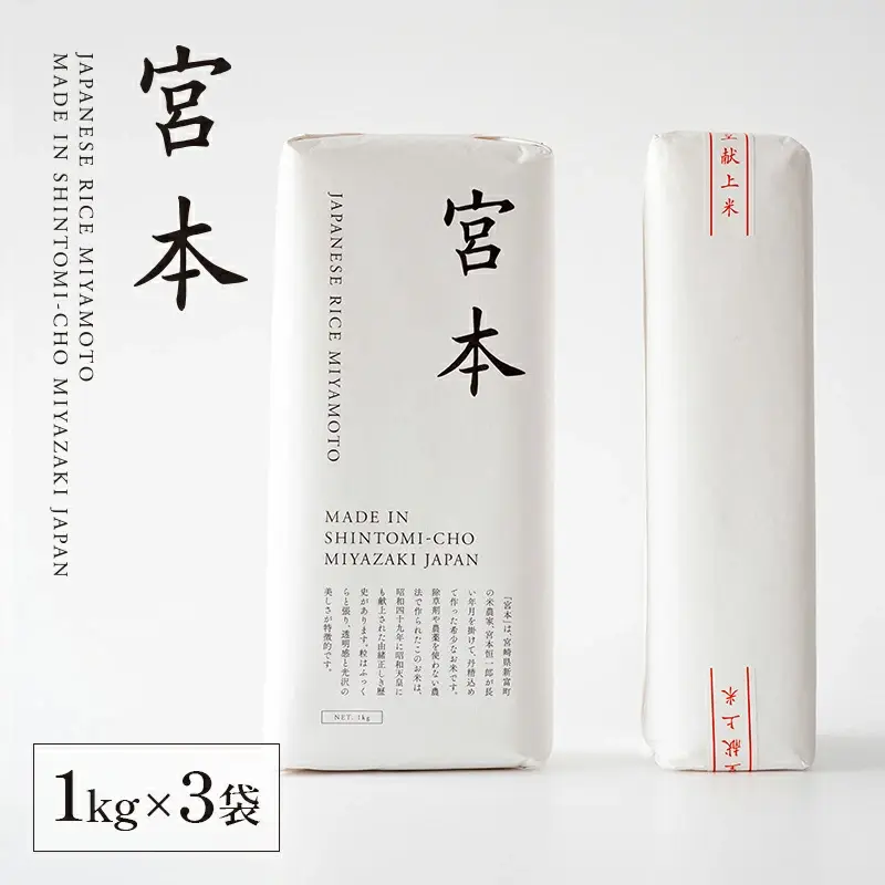 宮崎の太陽の恵みをたっぷり浴びながら、農薬を使わず有機肥料で手間ひまかけて栽培された有機米「宮本」。今年収穫されたばかりの新米「にこまる」を1kg × 3袋でお届けいたします。空気を通さない密封真空パッケージ包装と上質なデザインで、贈り物にも最適です。