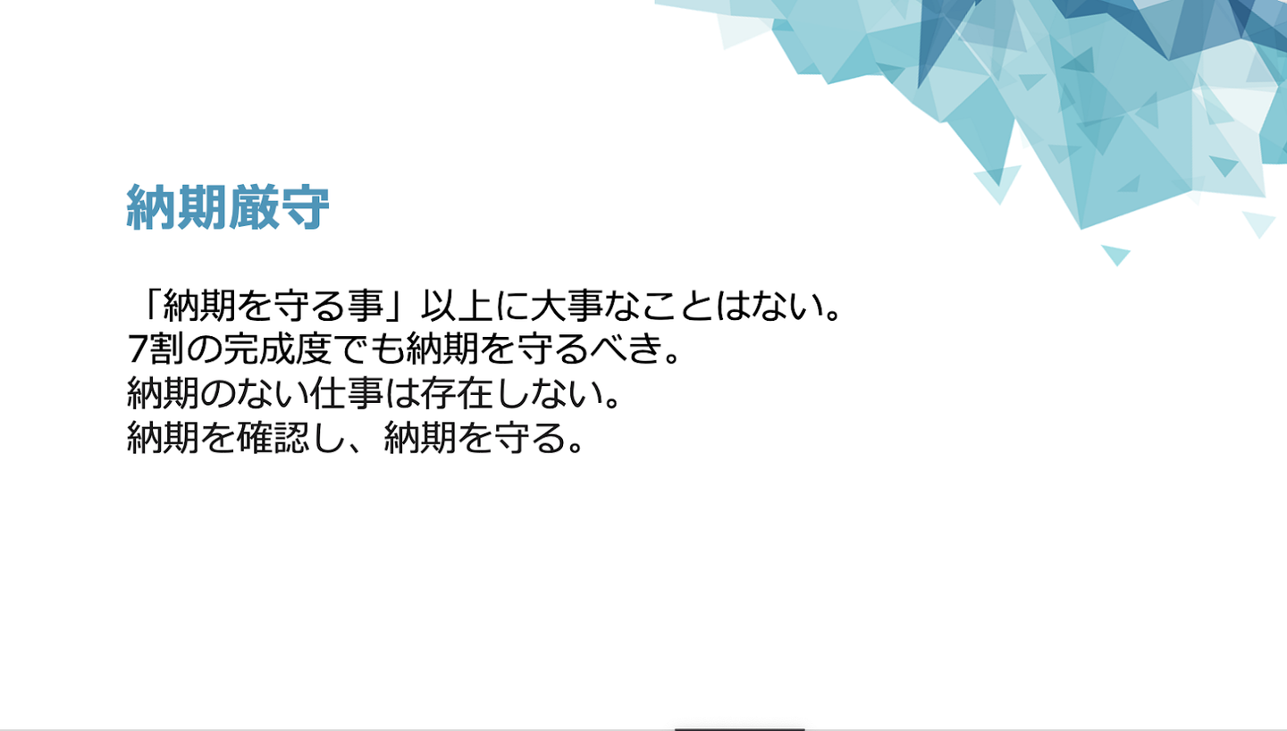 これは当たり前ですが大切なこと。社会人になっても納期が守れない人は言語道断です。クライアントに対してはもちろんのこと、自分が発注者側であっても、納期を守ることを徹底します。