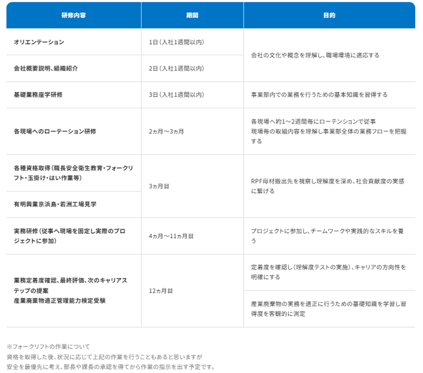 環境事業部新人研修ロードマップ