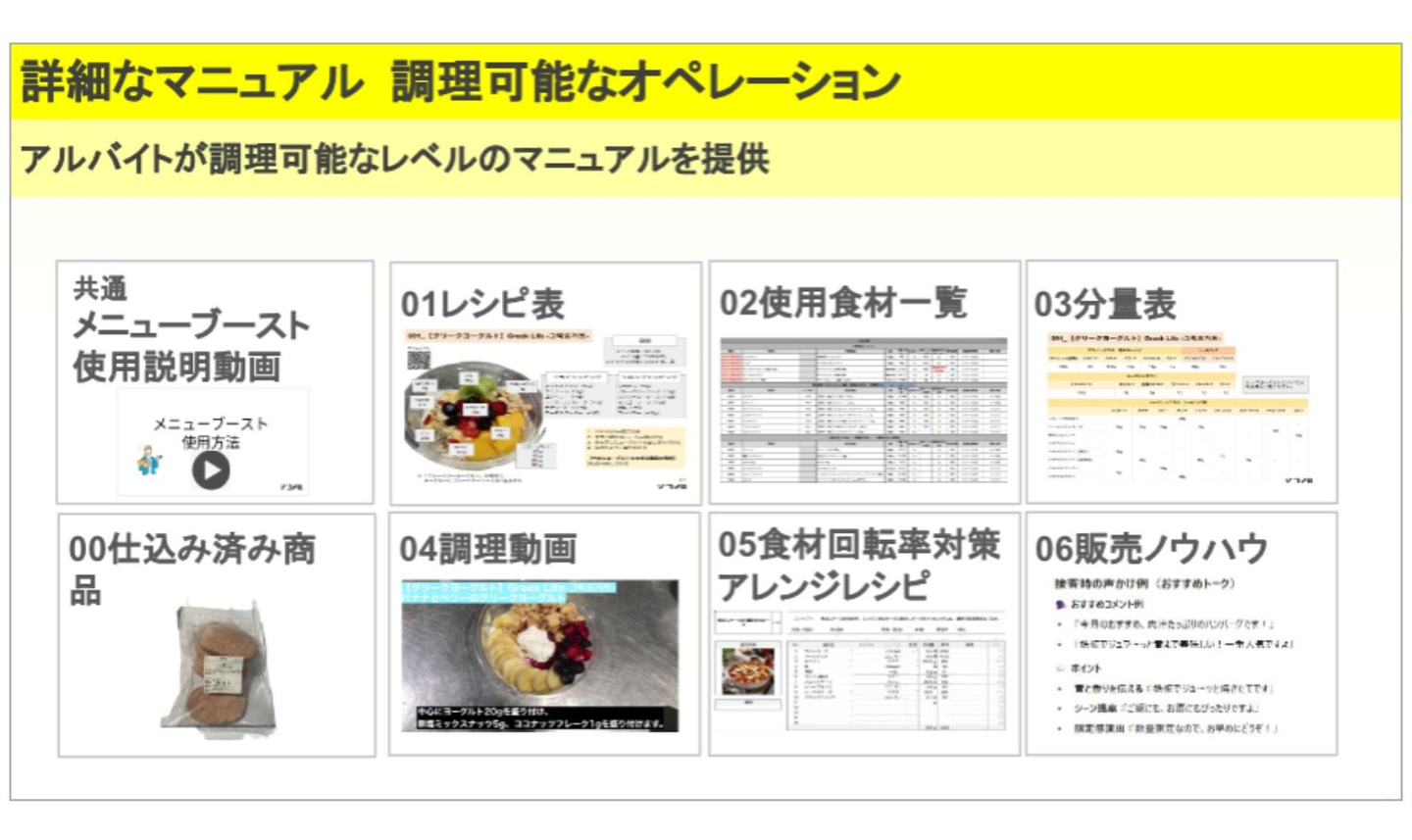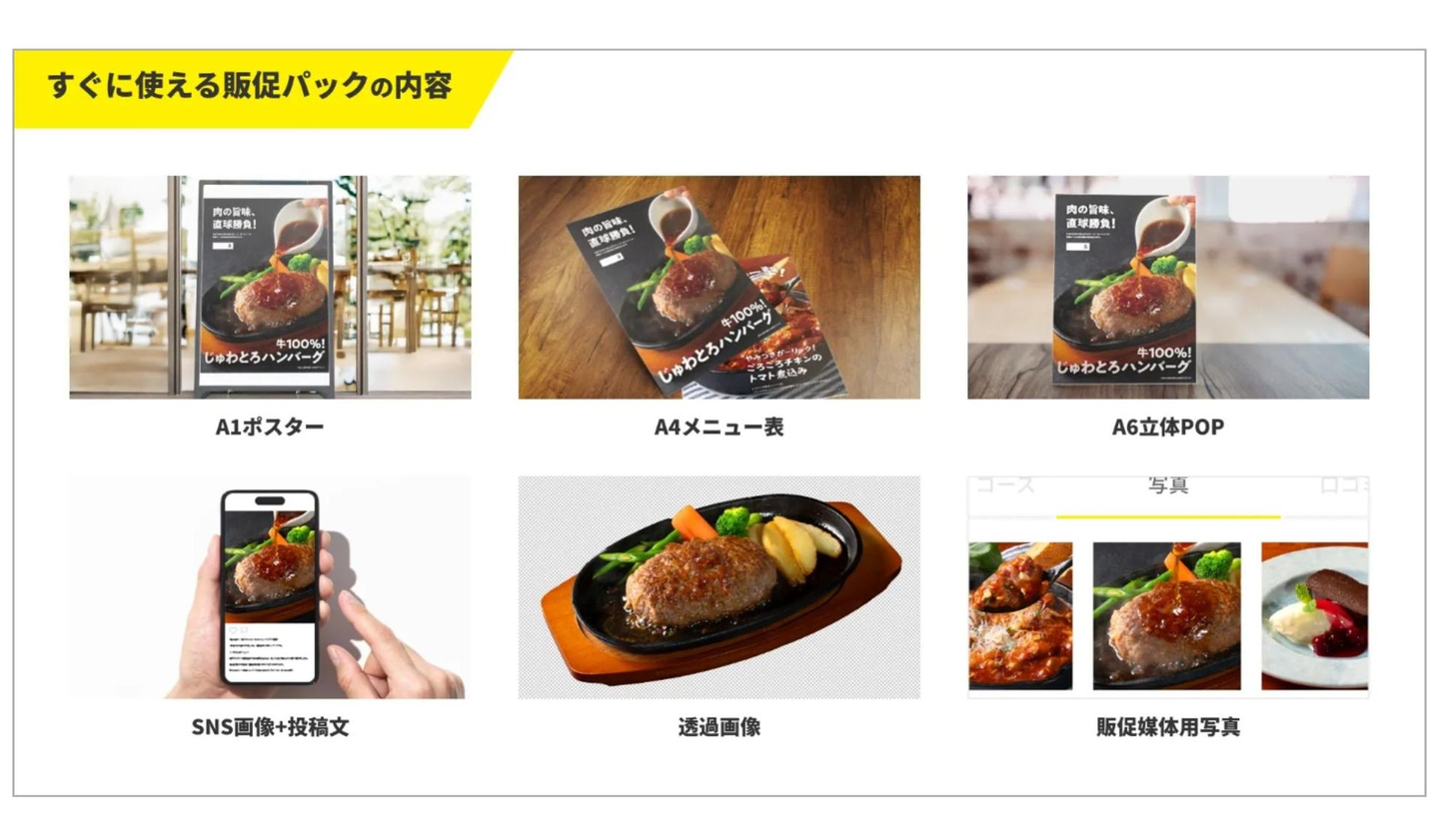 プロデザイナーが作成するPOP、チラシ、SNS用素材など、販促に必要なツール一式をセットで提供します。これにより、店舗は手間なくすぐに販売を開始でき、調理手順と販促を一体で支援することで、効果的な売上向上につなげます。